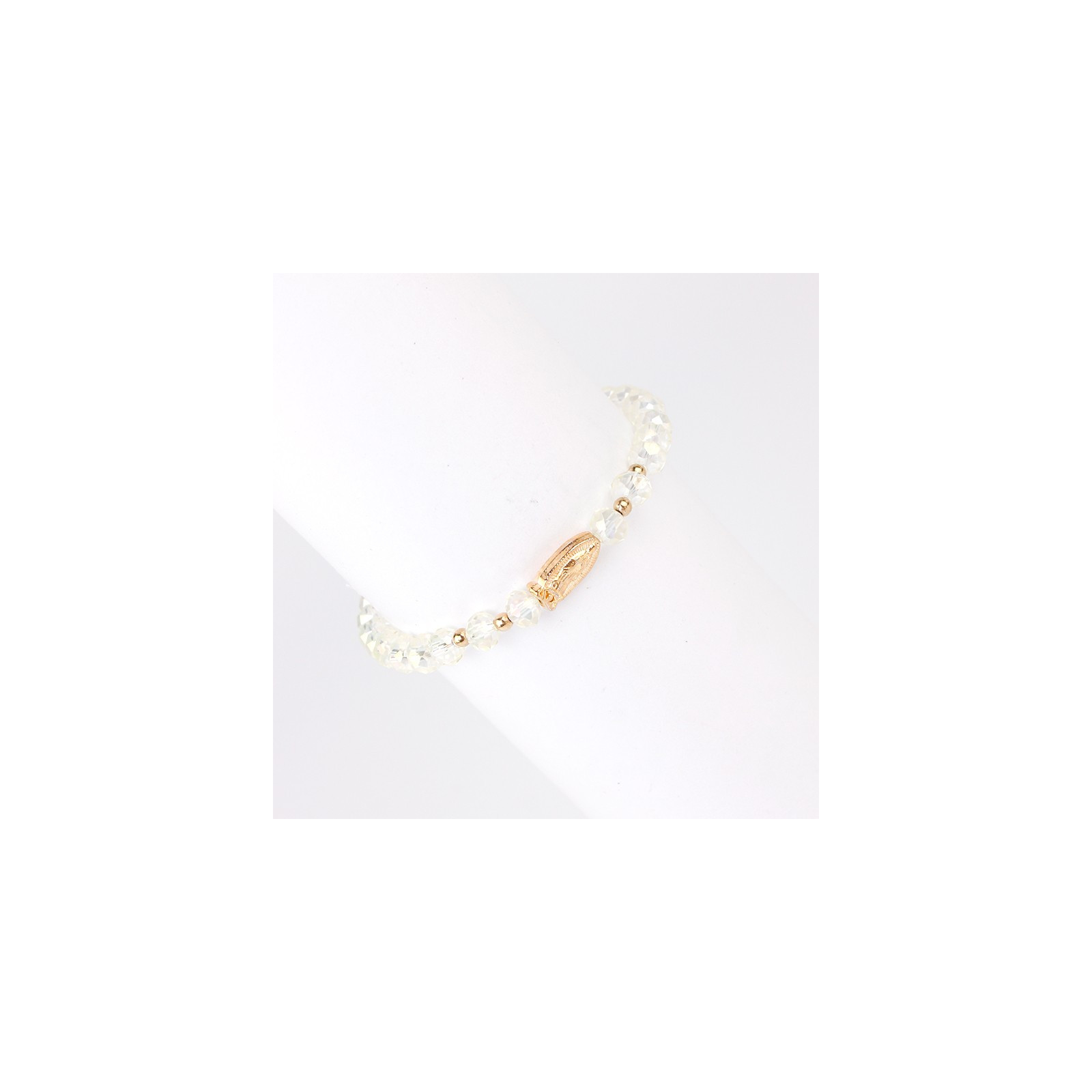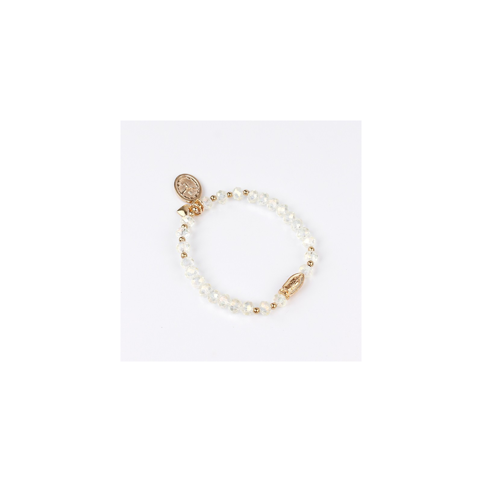 Pulsera elástica de rocas de cristal con dijes exclusivos de distintas formas y tamaños dorados.
