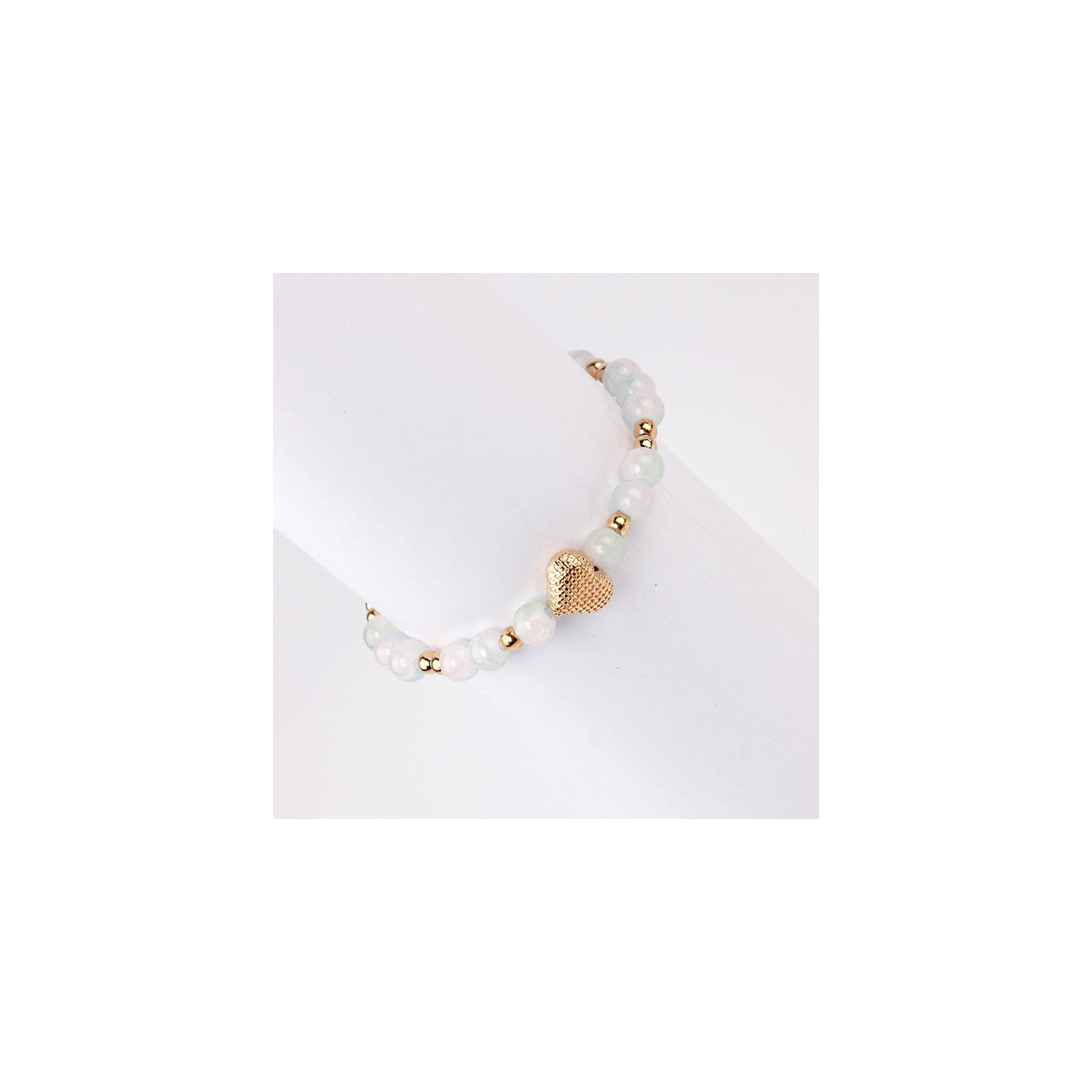 Pulsera elástica de piezas de vidrio energéticas con dije pasante exclusivo con forma de corazón dorado.
