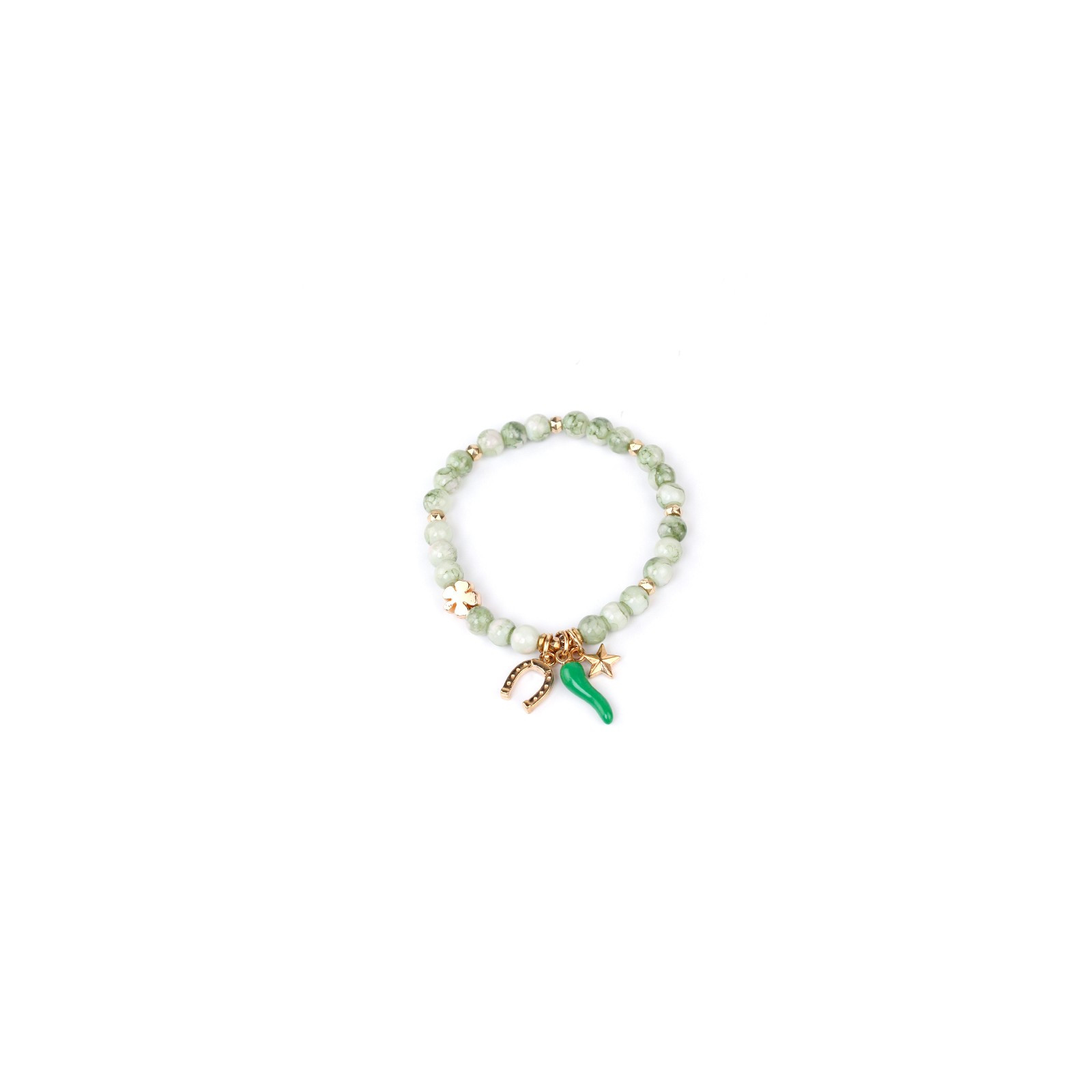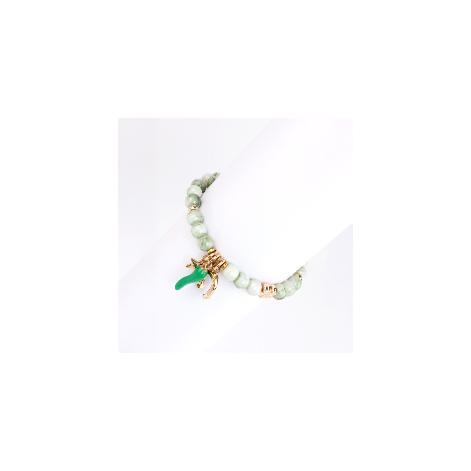 Pulsera elástica de bolitas y ají de vidrio con dijes exclusivos dorados.