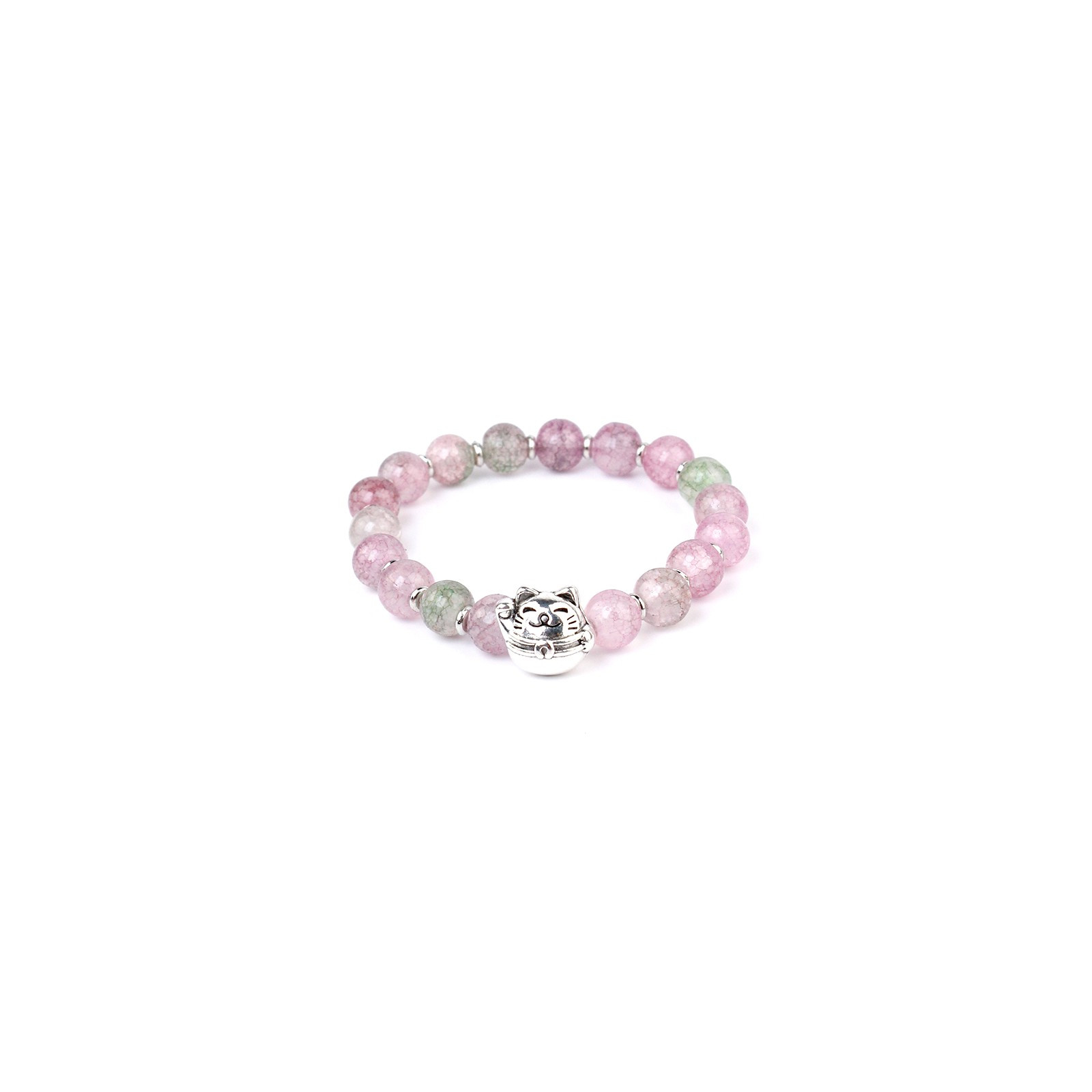 Pulsera de bolitas de vidrio de 8mm, con piezas pasantes de CCB y dije exclusivo con forma de gato de la fortuna.