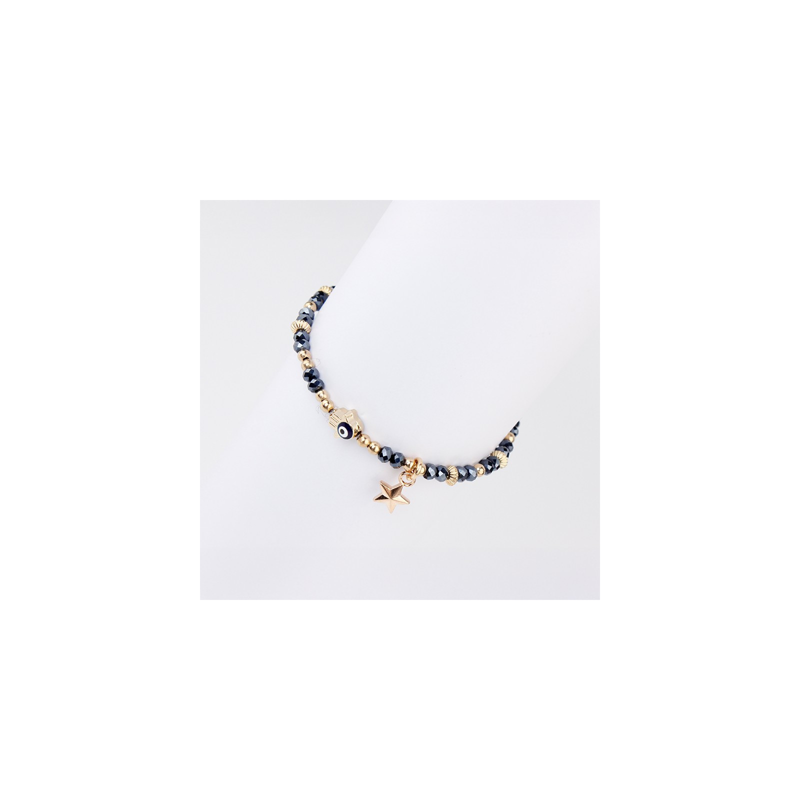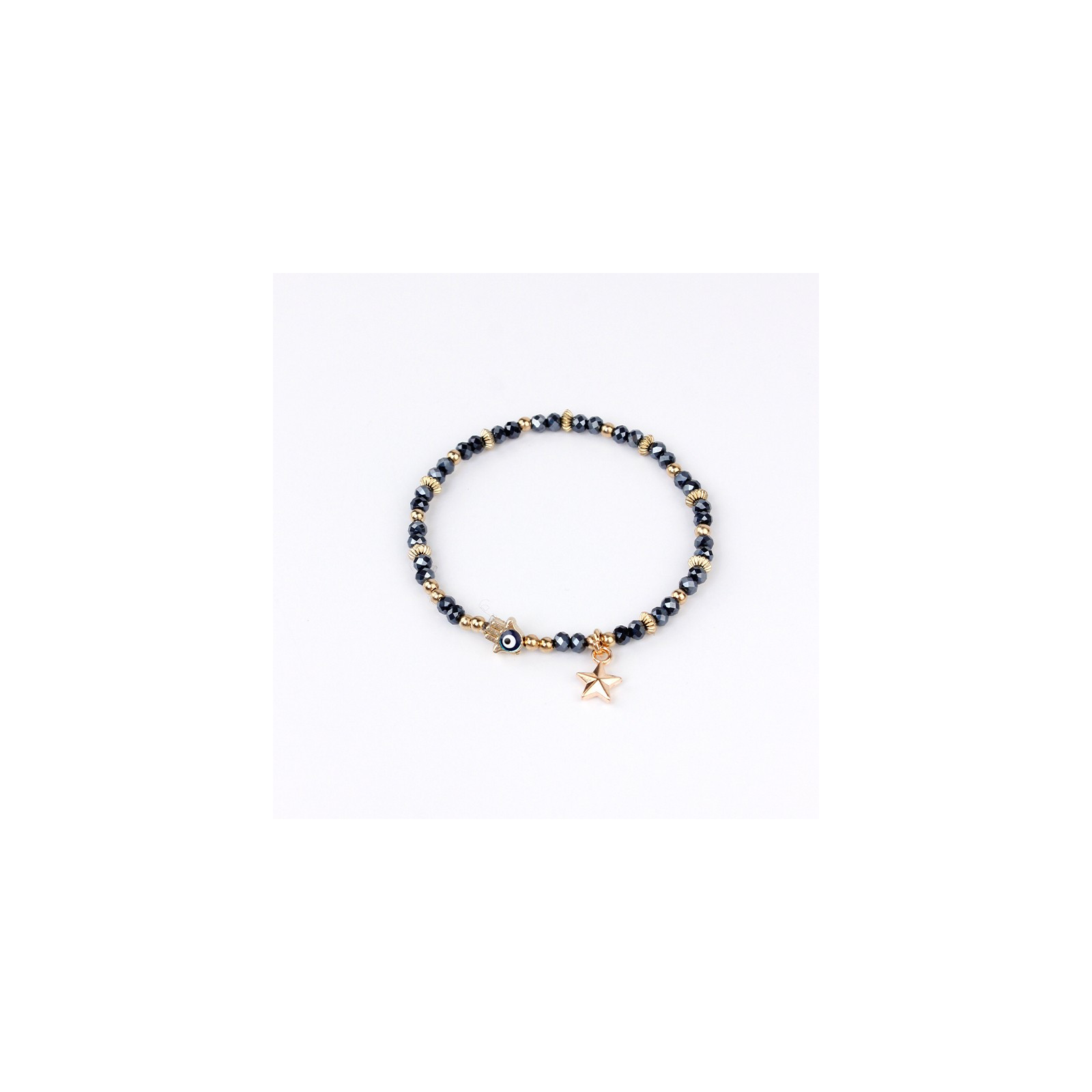 Pulsera elástica de rocas de cristal con dijes exclusivos pintados a mano dorados.