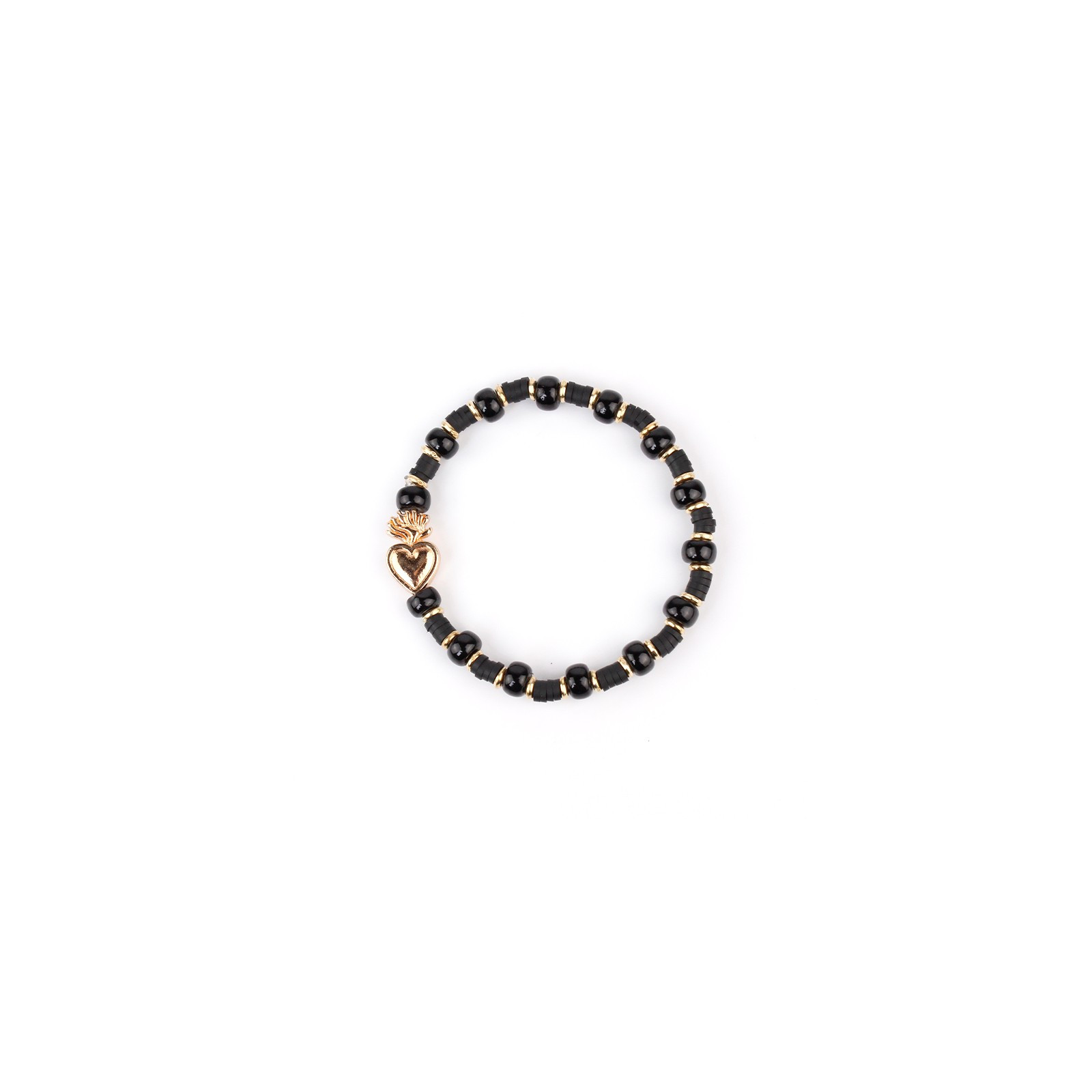 Pulsera elástica elaborada con piezas exclusivas de vidrio, fimo perlado, piezas pasantes de CCB y dije exclusivo con forma de corazón.