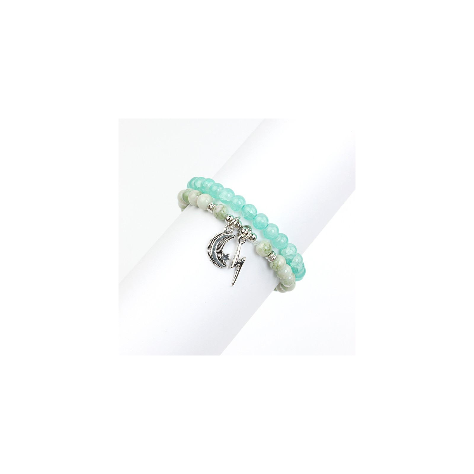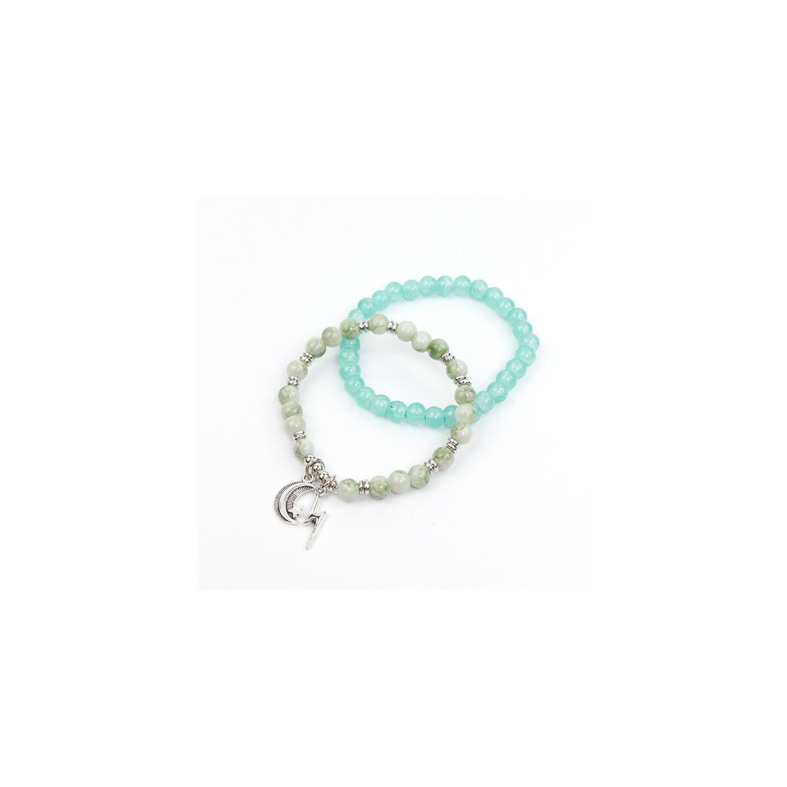 Set de dos pulseras elásticas de piezas de vidrio con dijes exclusivos níquel.