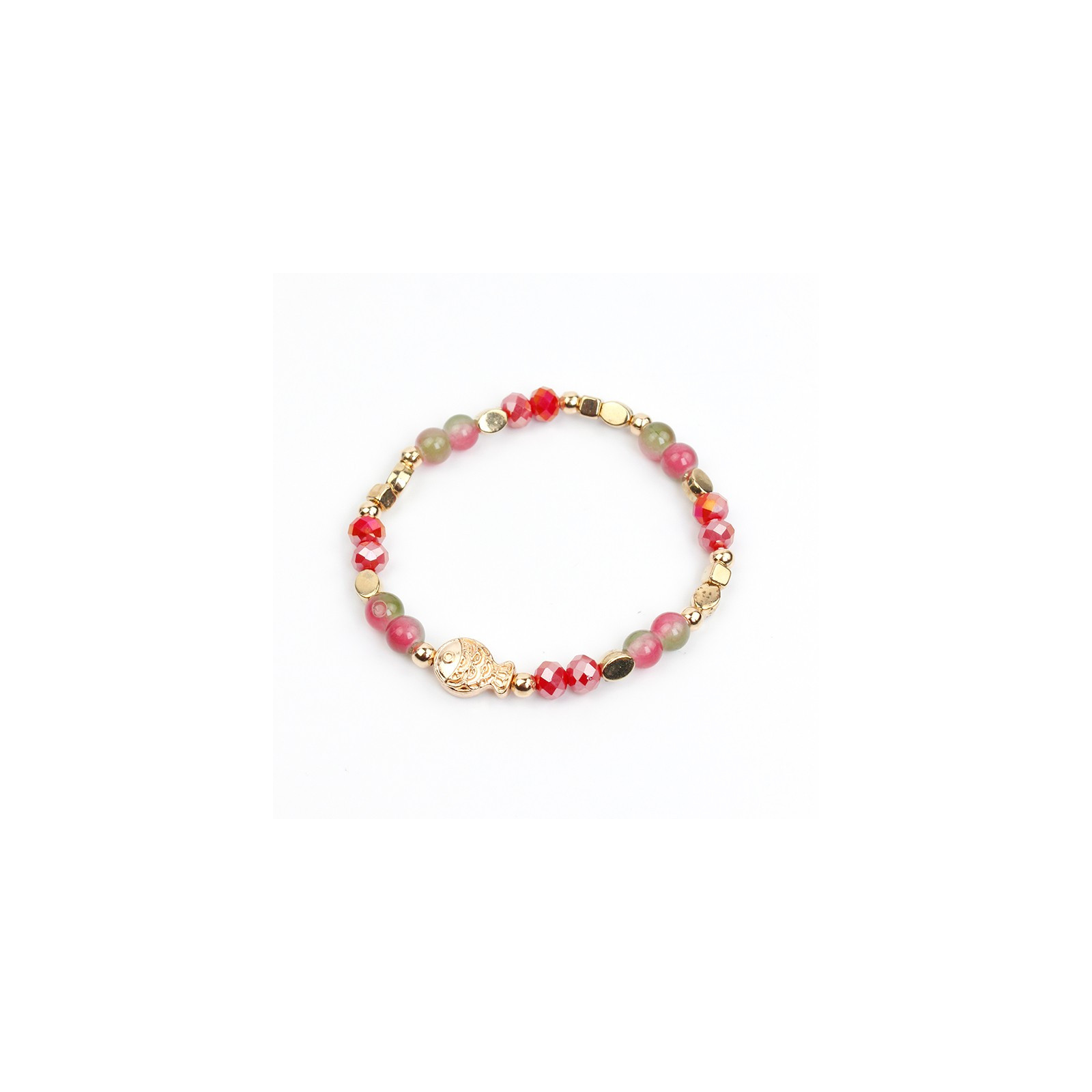 Pulsera elástica, elaborada en bolitas de vidrio diferenciadas, combinadas con ricas de cristal,piezas pasantes de CCB y dije exclusivo con forma de pez.