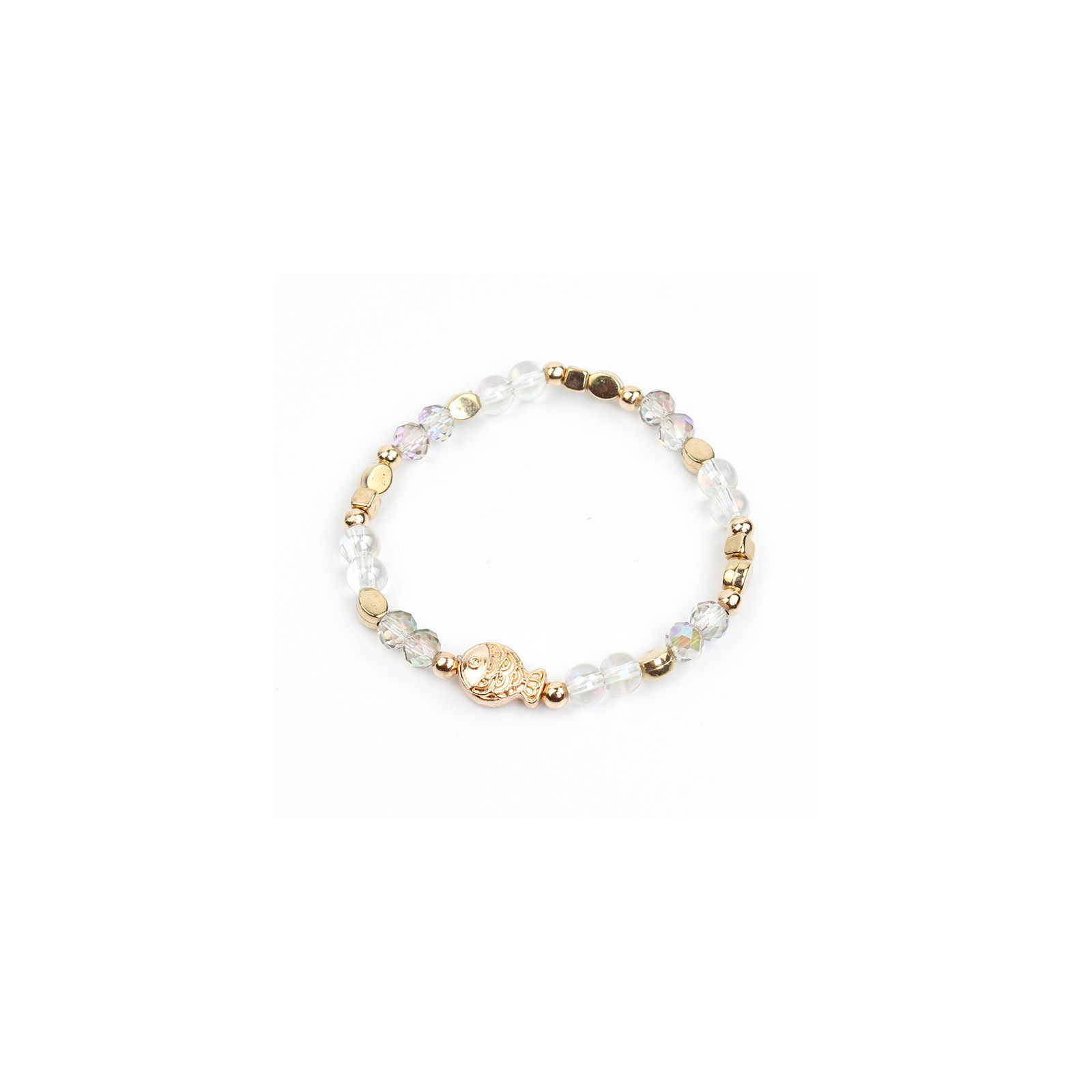 Pulsera elástica, elaborada en bolitas de vidrio diferenciadas, combinadas con ricas de cristal,piezas pasantes de CCB y dije exclusivo con forma de pez.