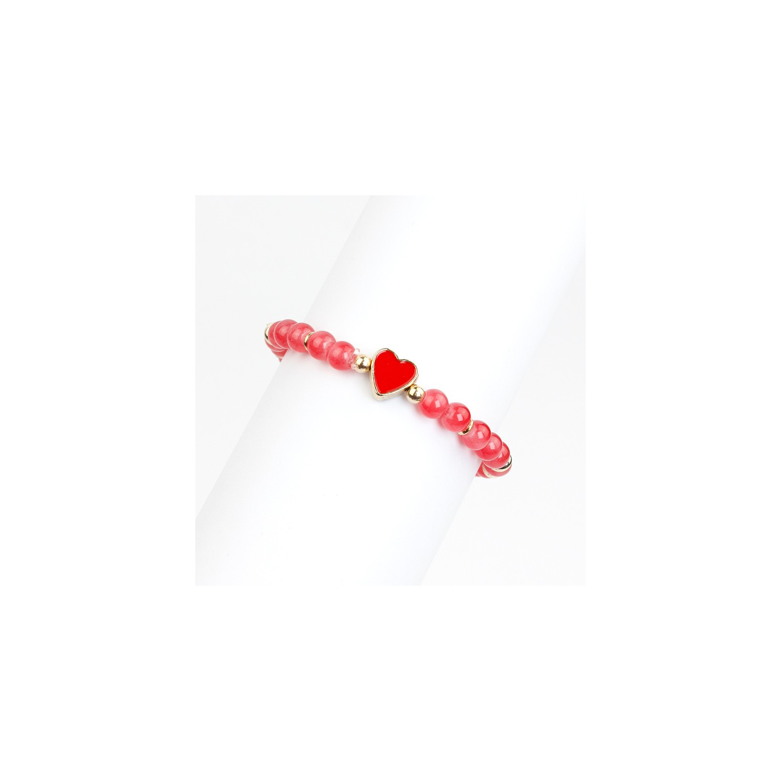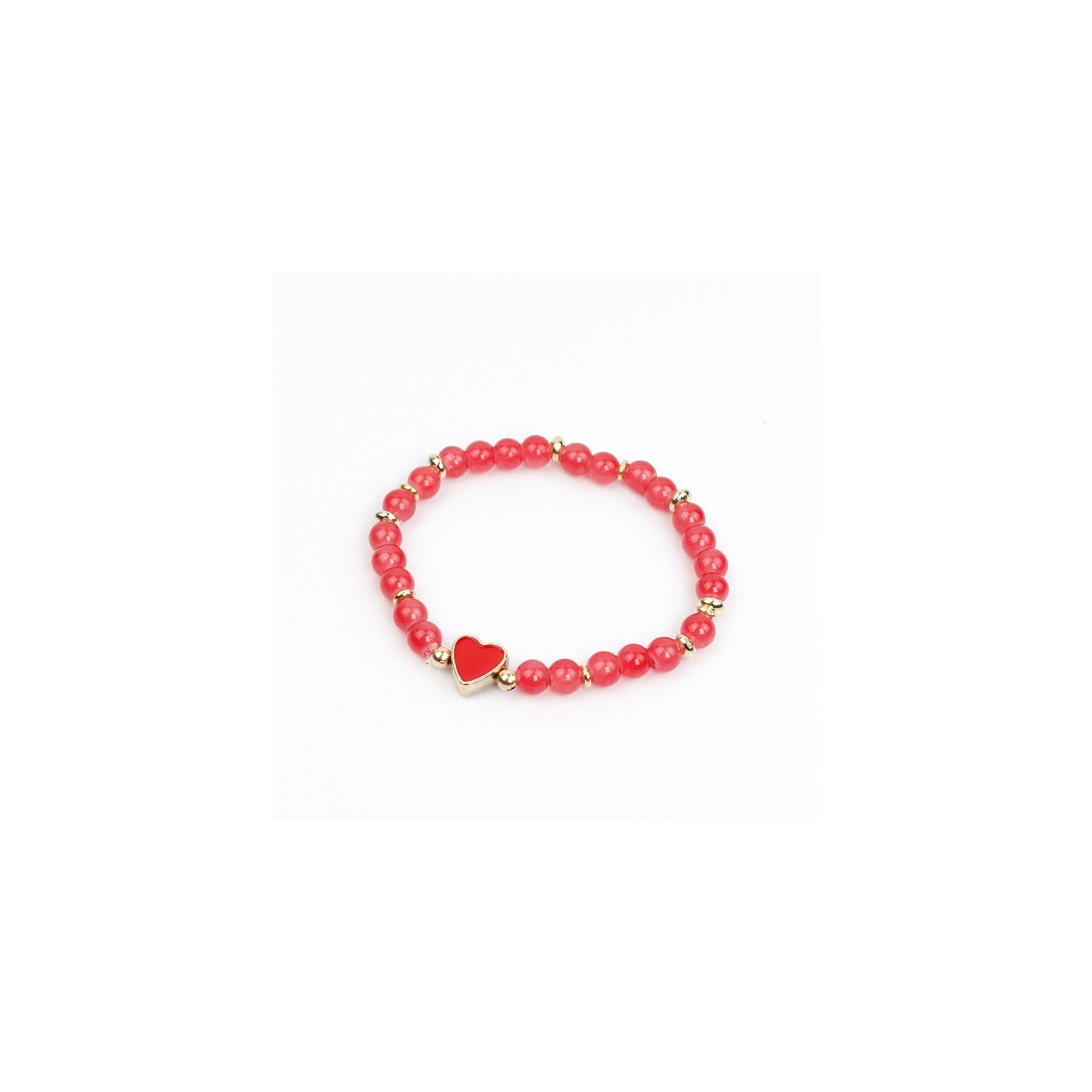 Pulsera elástica, elaborada en bolitas de vidrio diferenciadas, combinadas con piezas pasantes de CCB y dije exclusivo pintado a mano con forma de corazón.