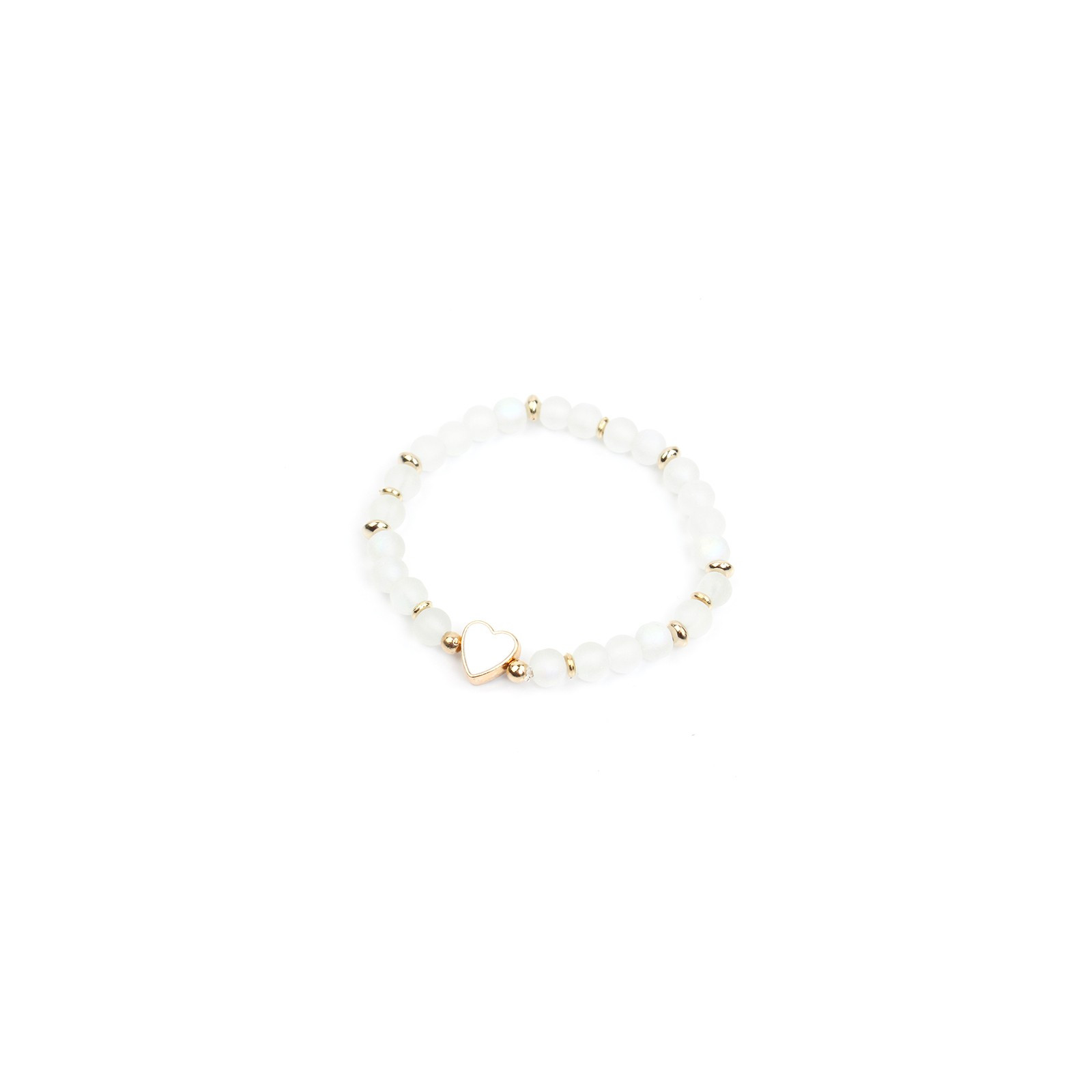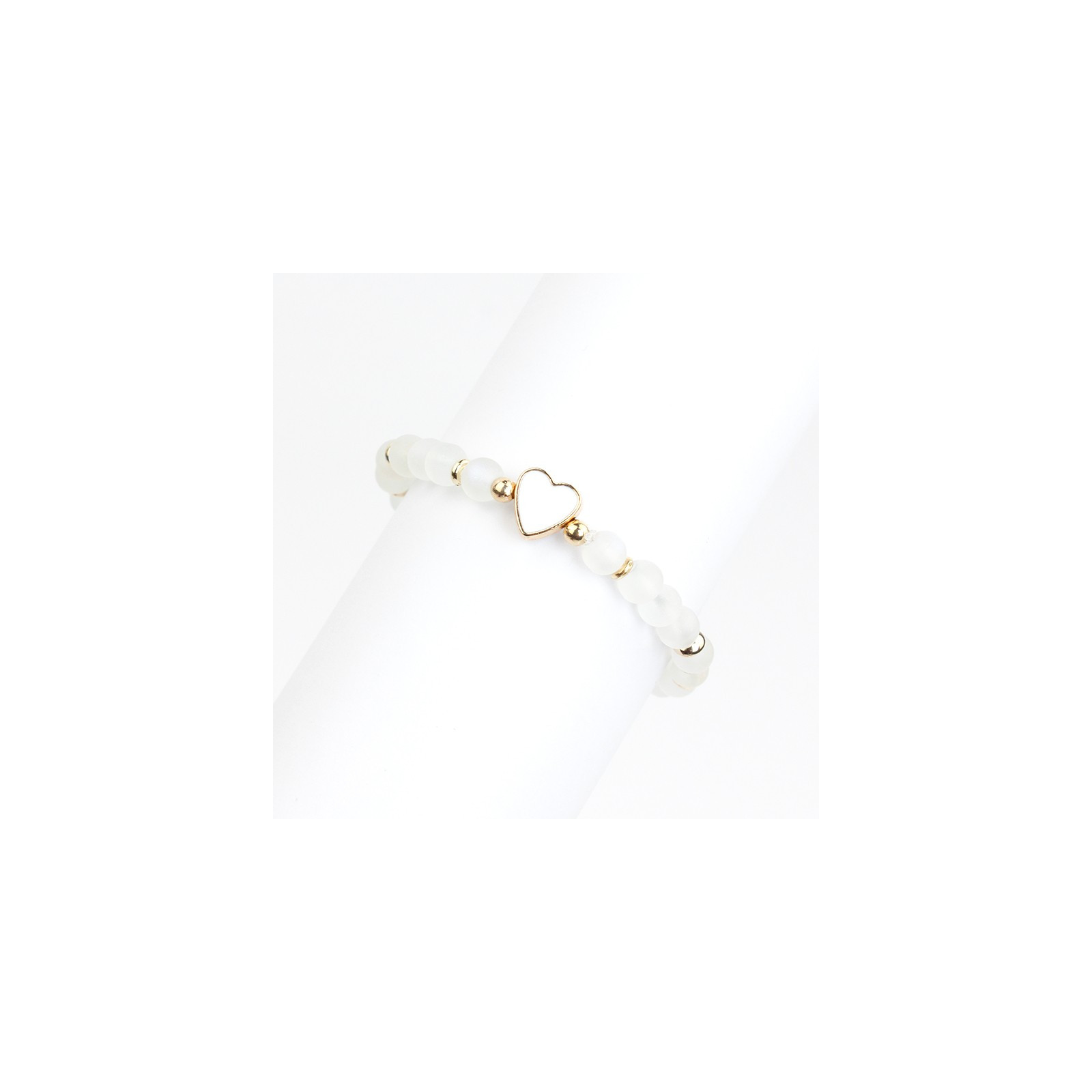Pulsera elástica, elaborada en bolitas de vidrio diferenciadas, combinadas con piezas pasantes de CCB y dije exclusivo pintado a mano con forma de corazón.