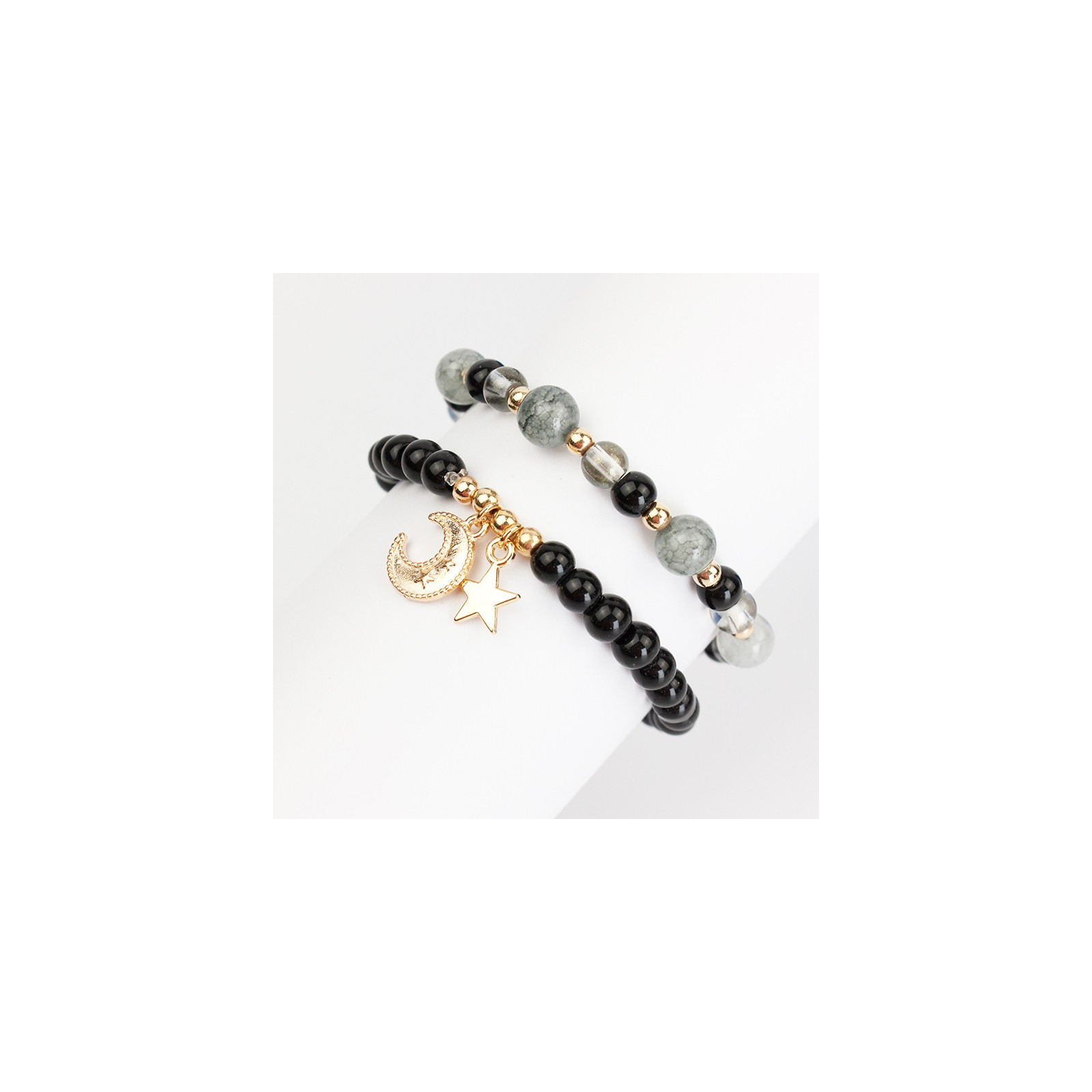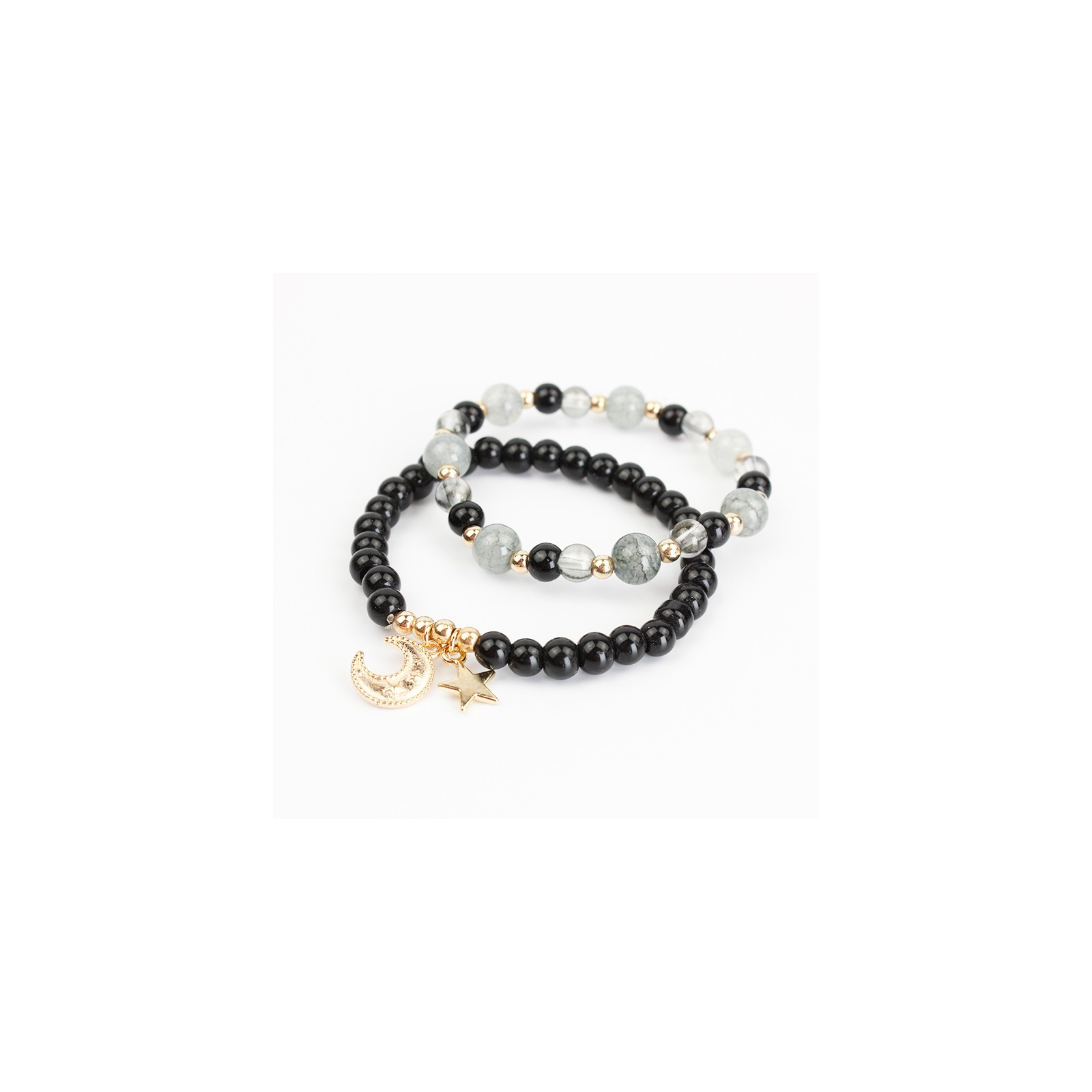 Set de dos pulseras elásticas intervenidas con bolitas de vidrio energéticas , piezas exclusivas de CCB y dijes de fundición dorados.
