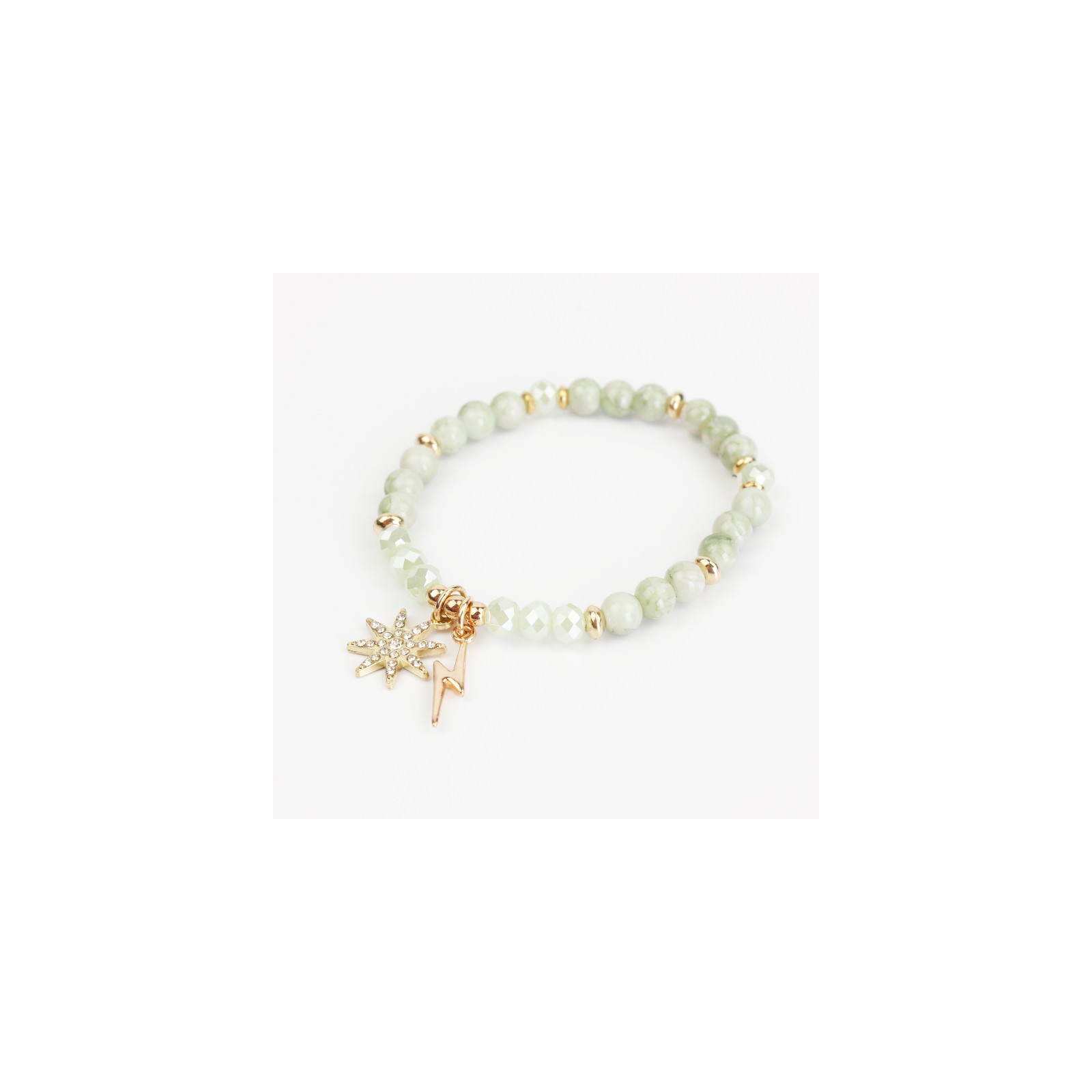 Pulsera elástica, elaborada en bolitas de vidrio diferenciadas, combinadas con piezas pasantes de CCB, dije exclusivo de strass con forma de sol y dije dorado de fundición en forma de rayo.