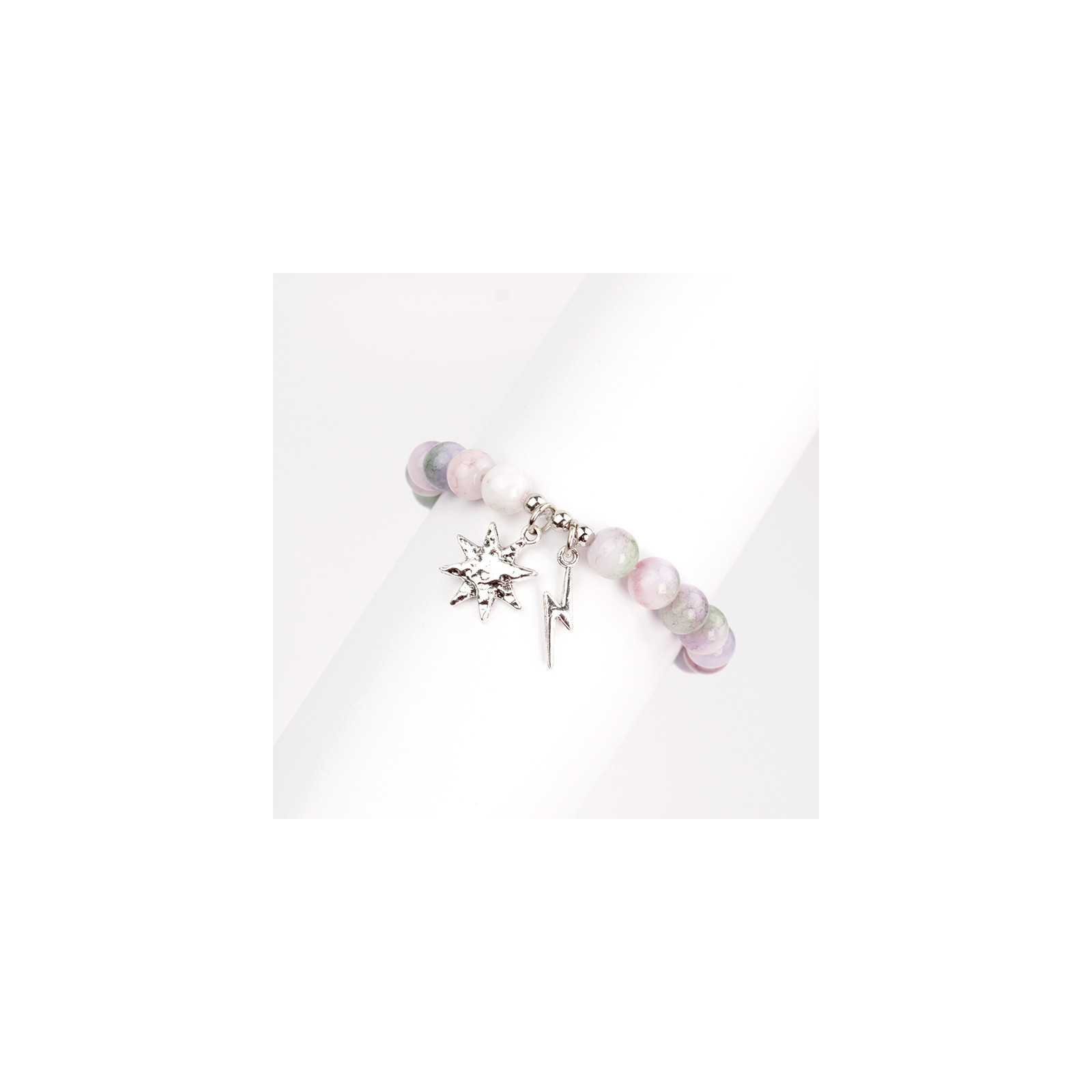 Pulsera de bolitas de vidrio diferenciadas, con dijes exclusivos con forma de sol y rayo.