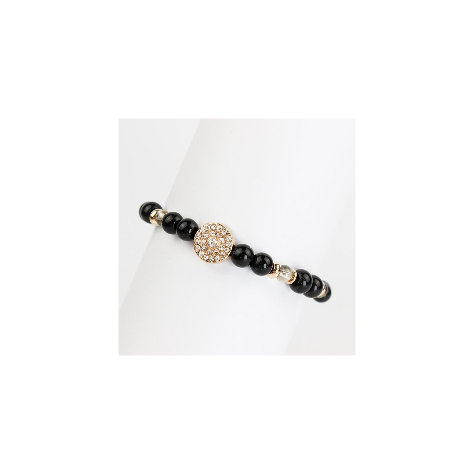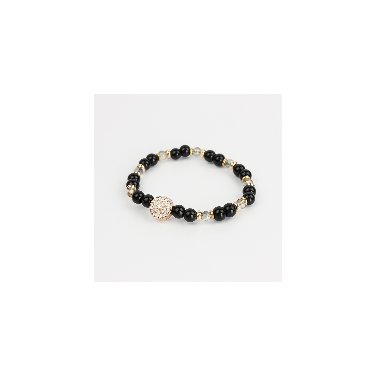 Pulsera elástica con bolitas de vidrio diferenciadas, piezas pasantes de CCB y dije exclusivo de strass circular.