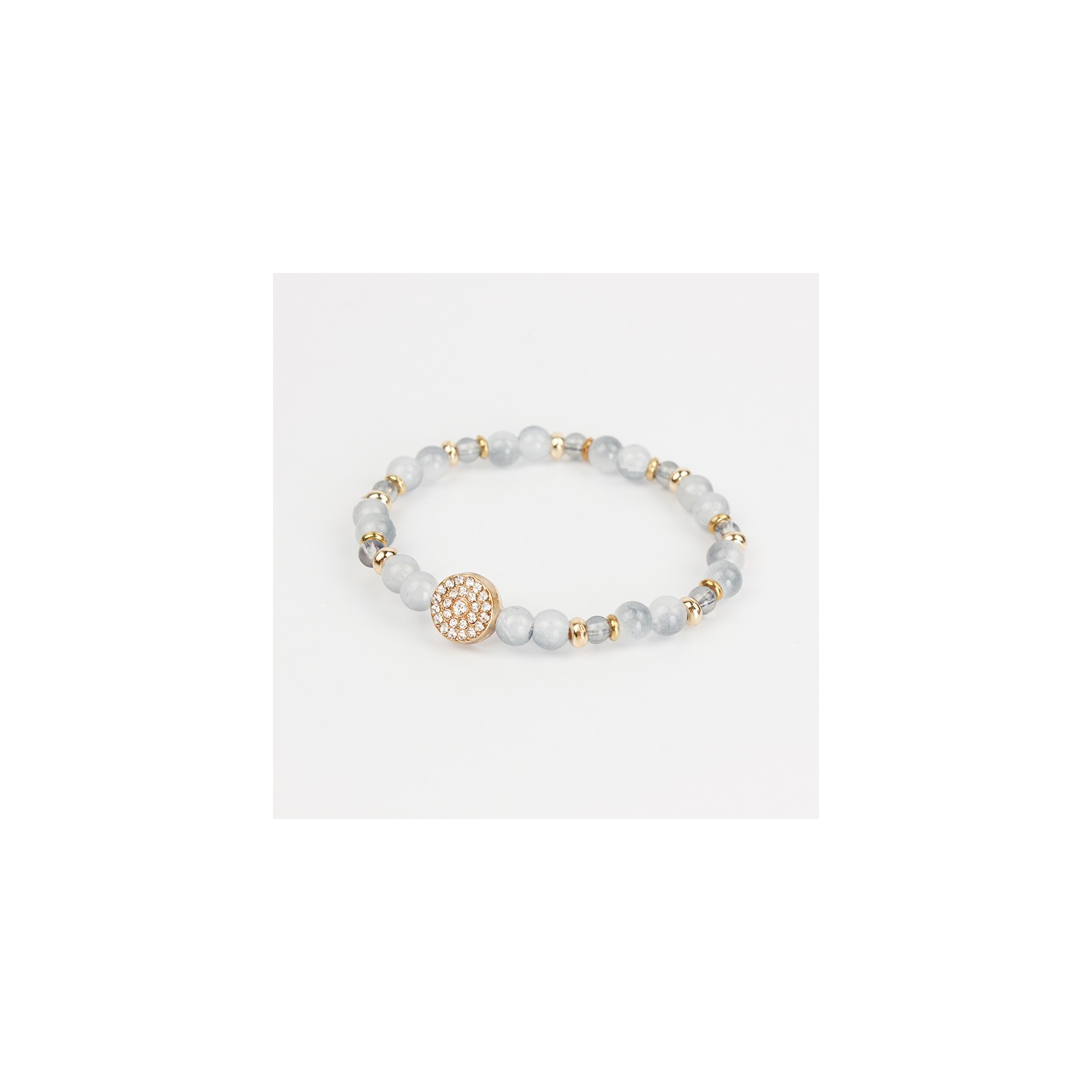 Pulsera elástica con bolitas de vidrio diferenciadas, piezas pasantes de CCB y dije exclusivo de strass circular.
