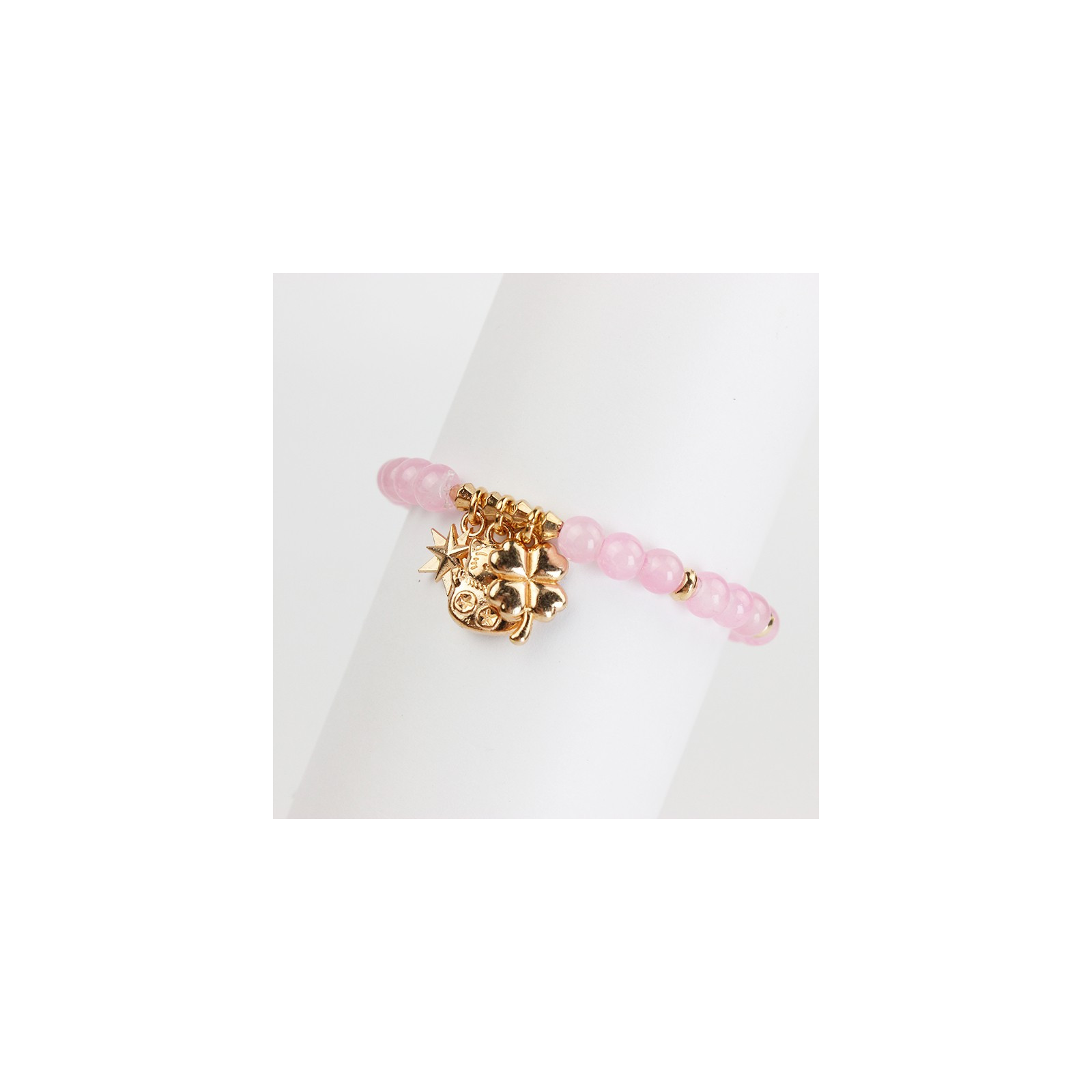 Pulsera elástica combinada con bolitas de vidrio, piezas pasantes de CCB y dijes exclusivos de fundición dorados.