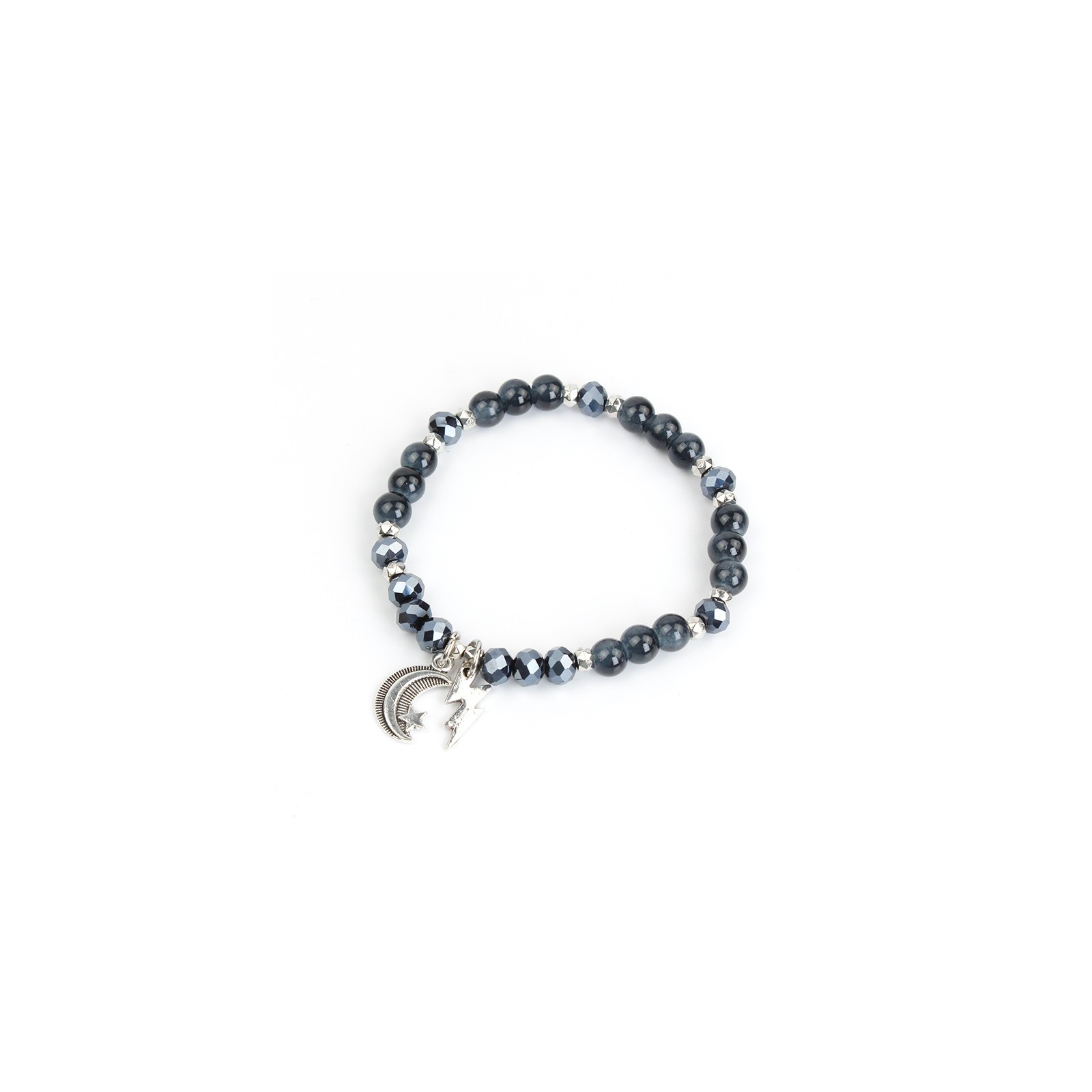 Pulsera elástica de bolitas de vidrio diferenciadas, combinadas con rocas de cristal, piezas pasantes de CCB y dijes exclusivos de fundición níquel.