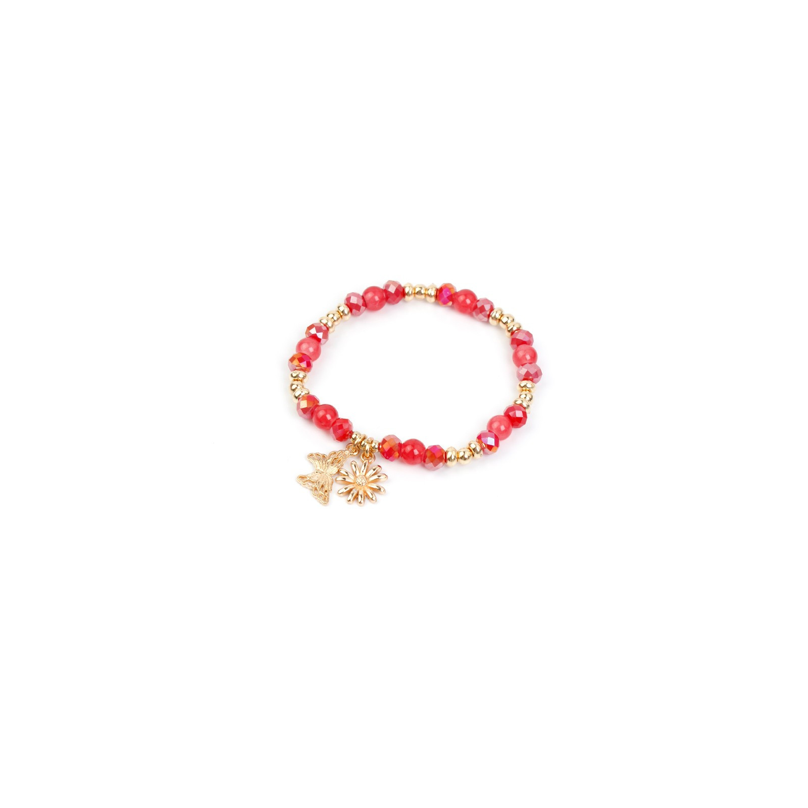 Pulsera elastica de rocas de cristal, combinadas con bolitas de vidrio diferenciadas, piezas pasantes de CCB y dijes exclusivos de fundición dorada.
