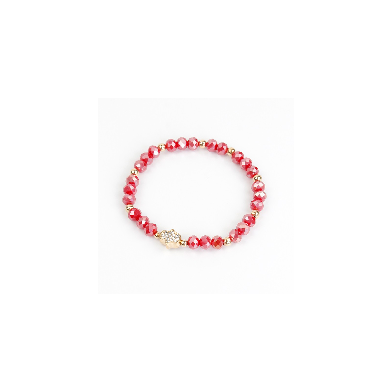 Pulsera elástica de roca de cristal combinadas con piezas pasantes de CCB y dije de strass exclusivo con forma de mano hamsa.