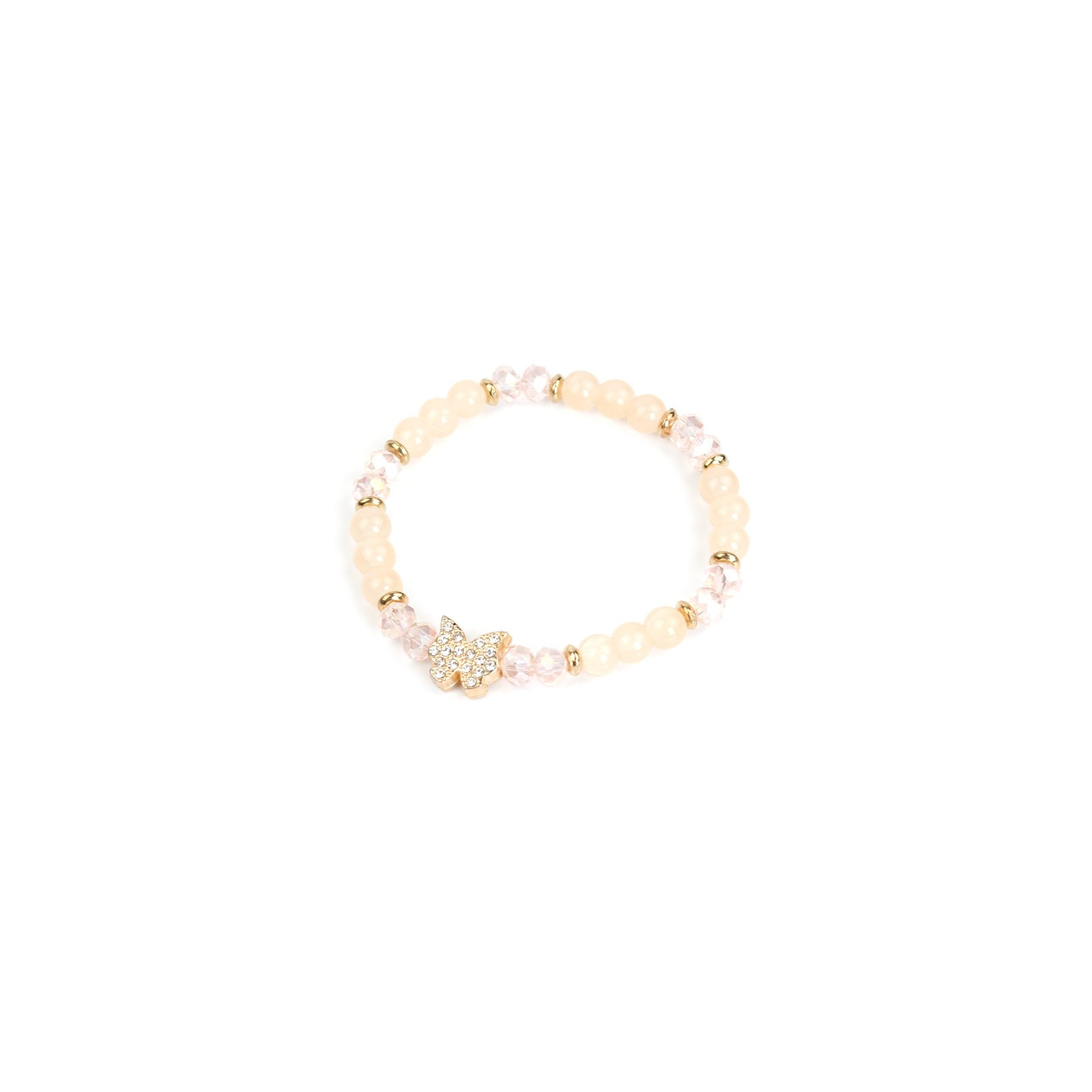 Pulsera elástica de bolitas de vidrio diferenciadas combinadas con roca de cristal, piezas pasantes de CCB y dije de strass exclusivo con forma de mariposa.