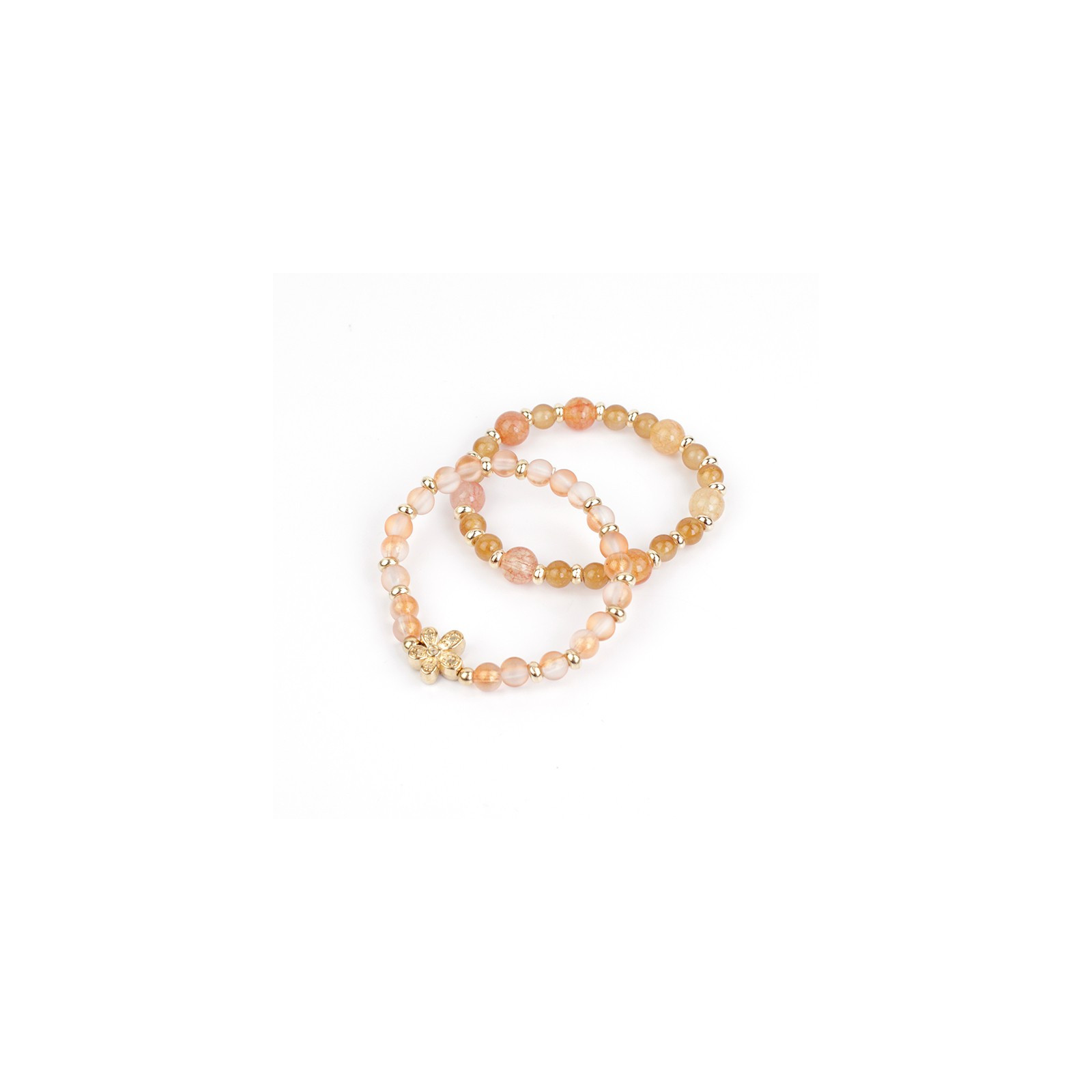Set de dos pulseras elásticas de bolitas de vidrio diferenciadas de distinto tamaño, combinadas con pasantes de CCB y dije de fundición con forma de flor.