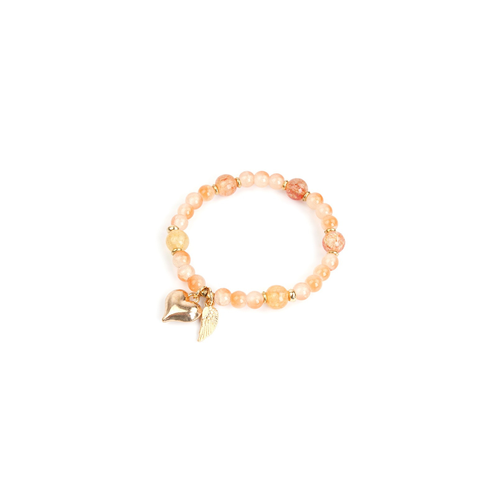 Pulsera elástica de bolitas de vidrio estalladas, combinadas con bolitas de vidrio diferenciadas de distinto tamaño, pasantes de CCB y dijes exclusivos de fundición dorada.