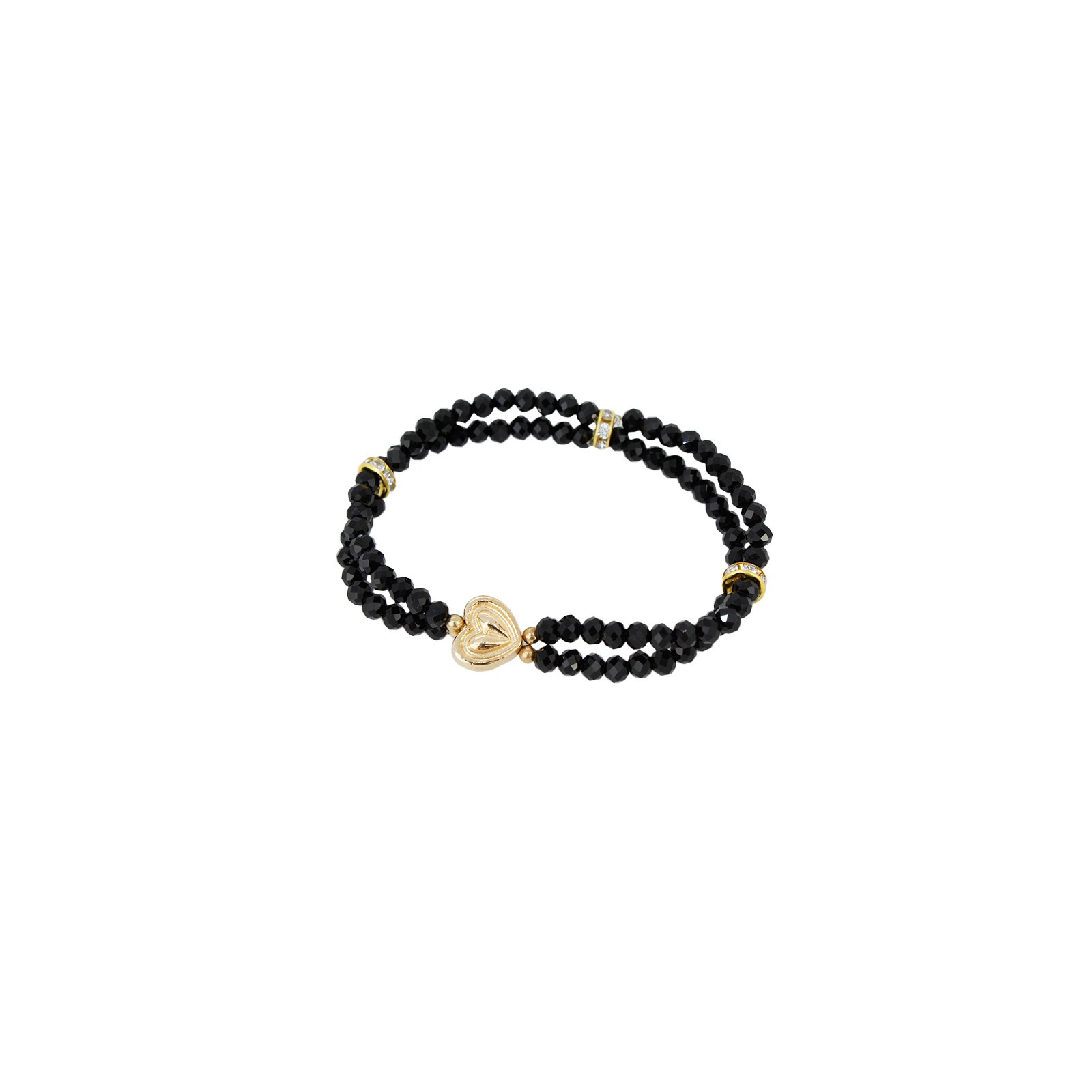 Pulsera elástica doble de rocas de cristal exclusivas combinadas con separadores de strass y dije exclusivo de fundición con forma de corazón dorado.