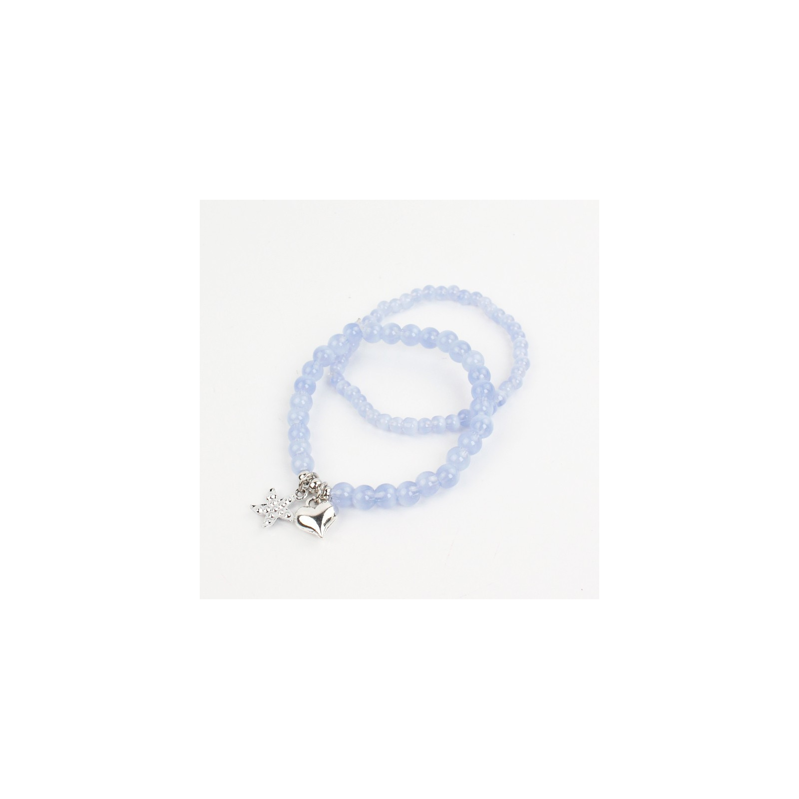 Set de dos pulseras elásticas de bolitas de vidrio diferenciadas, combinadas con dijes exclusivos de strass y  fundición níquel.