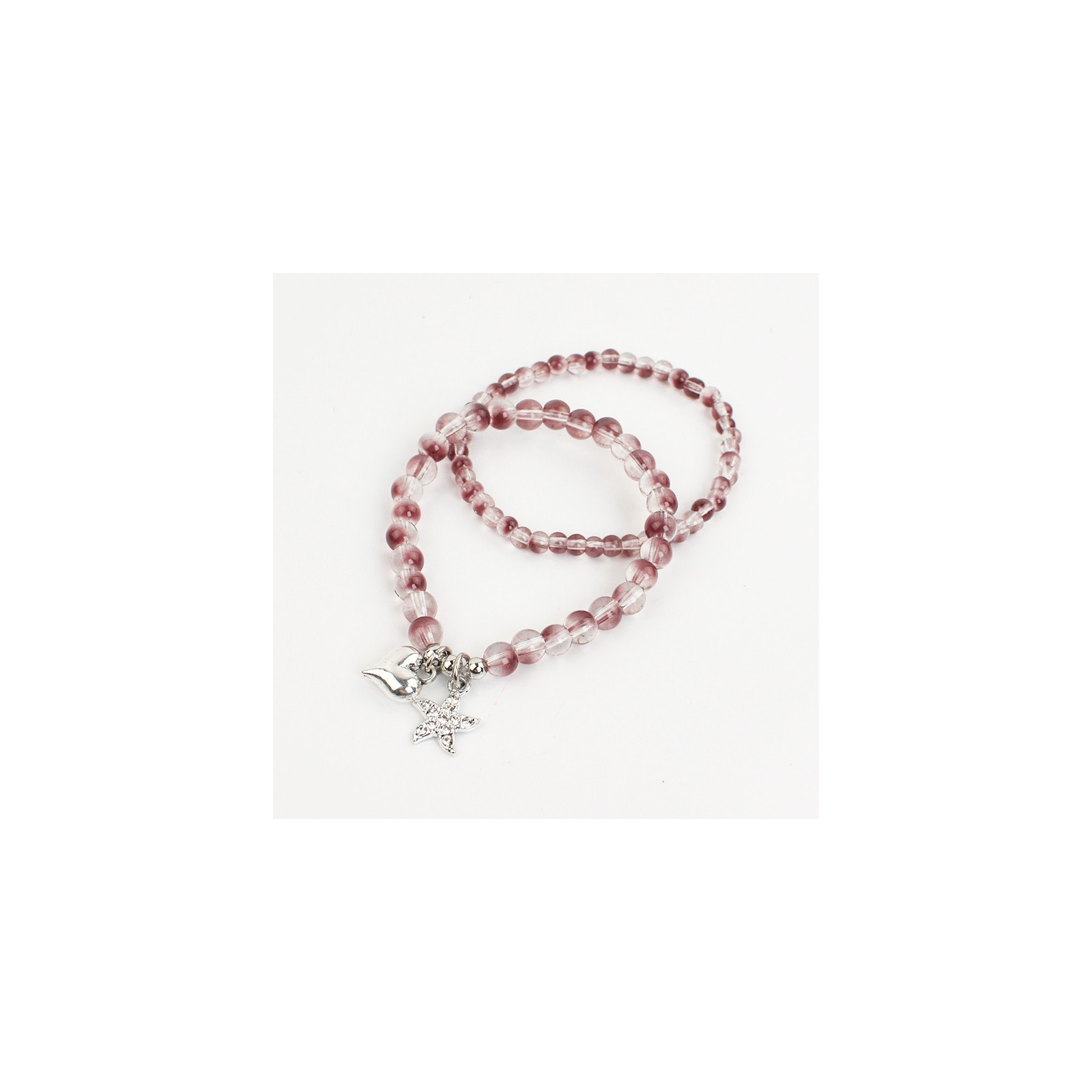 Set de dos pulseras elásticas de bolitas de vidrio diferenciadas, combinadas con dijes exclusivos de strass y  fundición níquel.