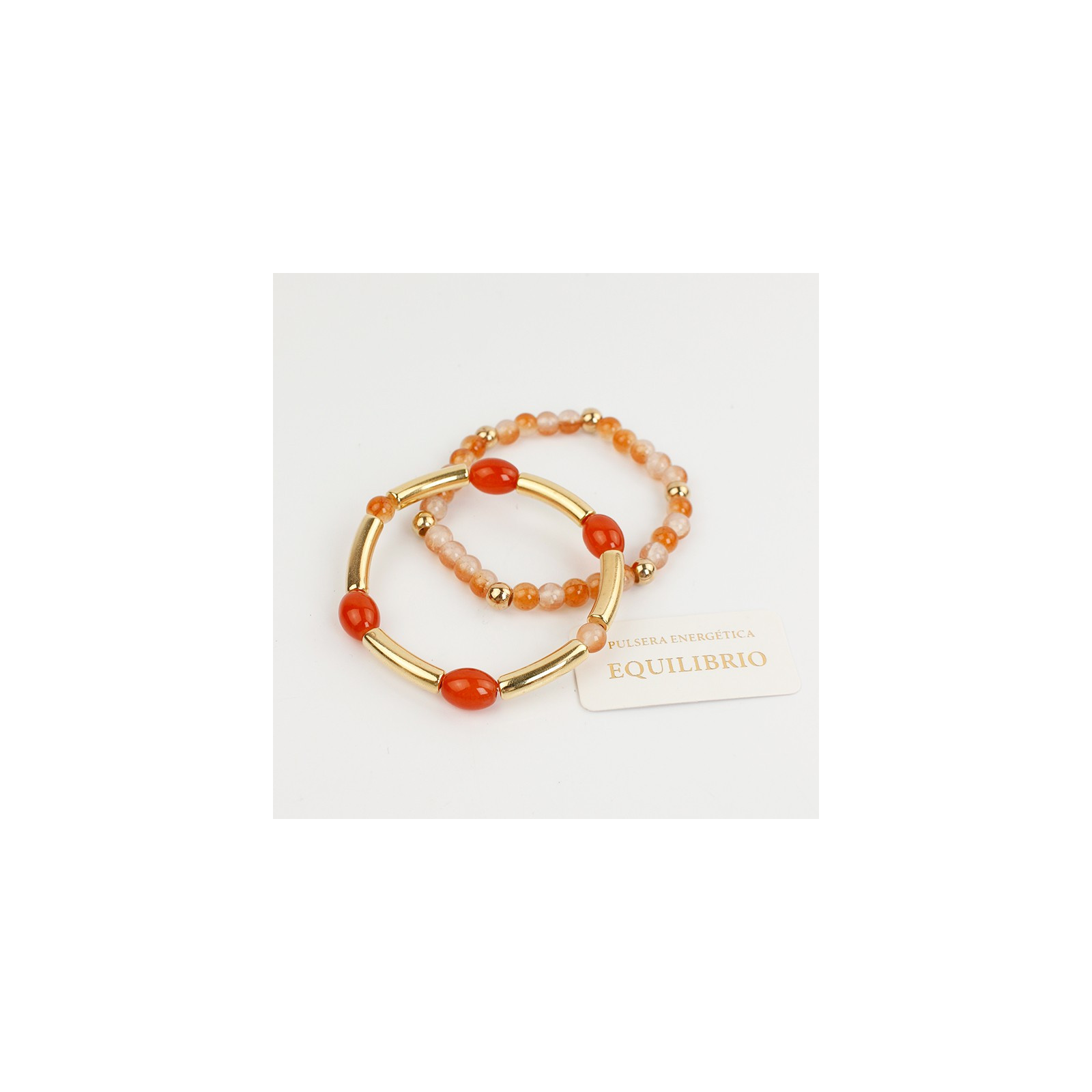 Set de dos pulseras elásticas una de bolitas de vidrio energéticas, otra d piezas de vidrio exclusivas combinadas con piezas pasantes de CCD dorado.
