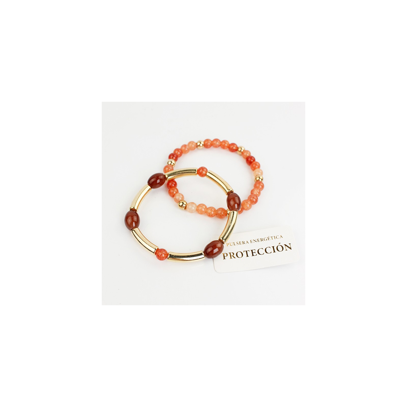 Set de dos pulseras elásticas una de bolitas de vidrio energéticas, otra d piezas de vidrio exclusivas combinadas con piezas pasantes de CCD dorado.