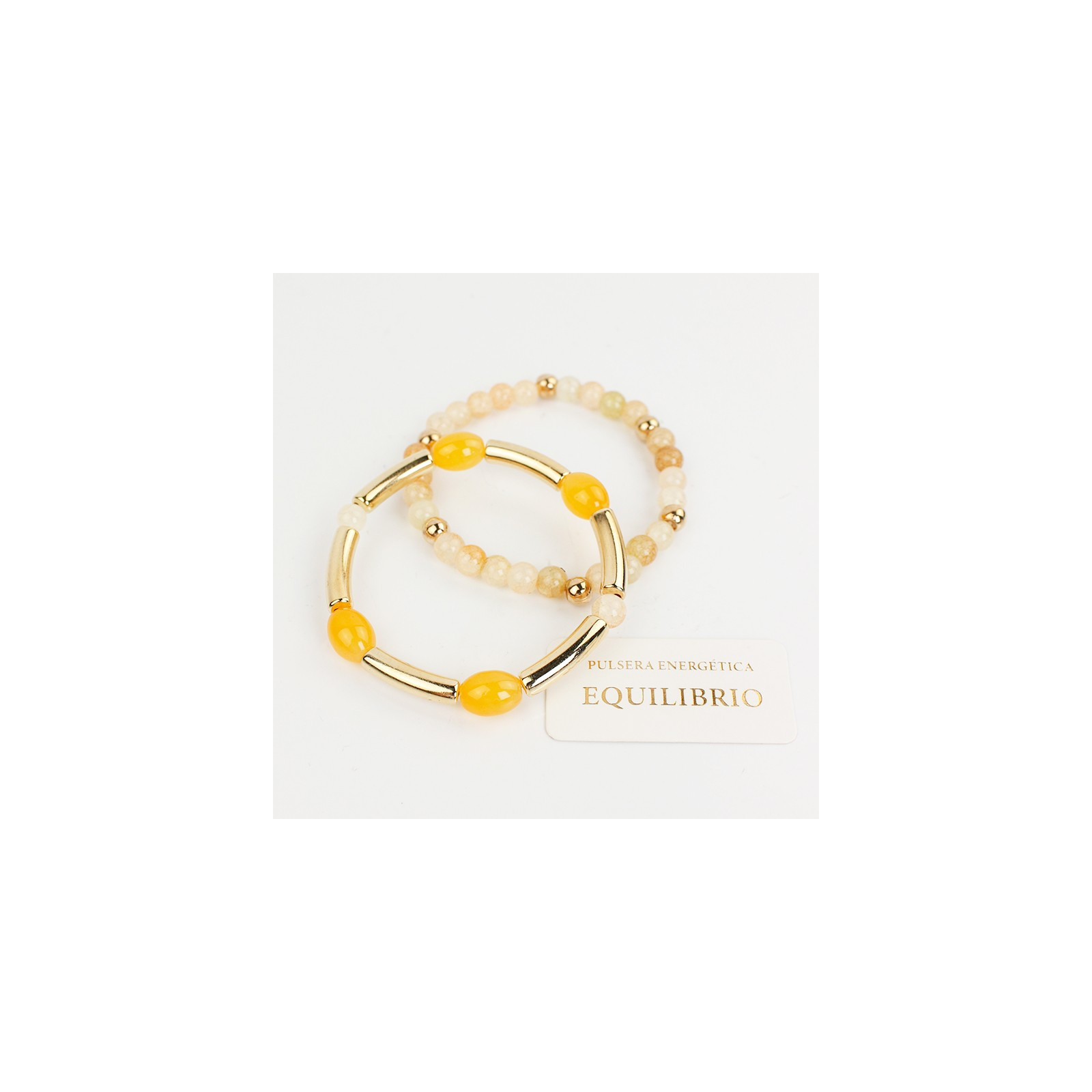 Set de dos pulseras elásticas una de bolitas de vidrio energéticas, otra d piezas de vidrio exclusivas combinadas con piezas pasantes de CCD dorado.