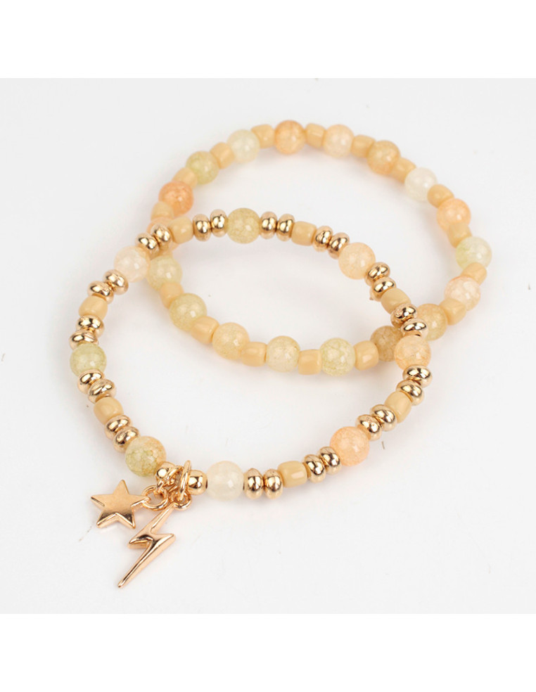 Set de dos pulseras elásticas de bolitas de vidrio diferenciadas, combinadas con mostacillas, separadores de CCB y dijes exclusivos de fundición.