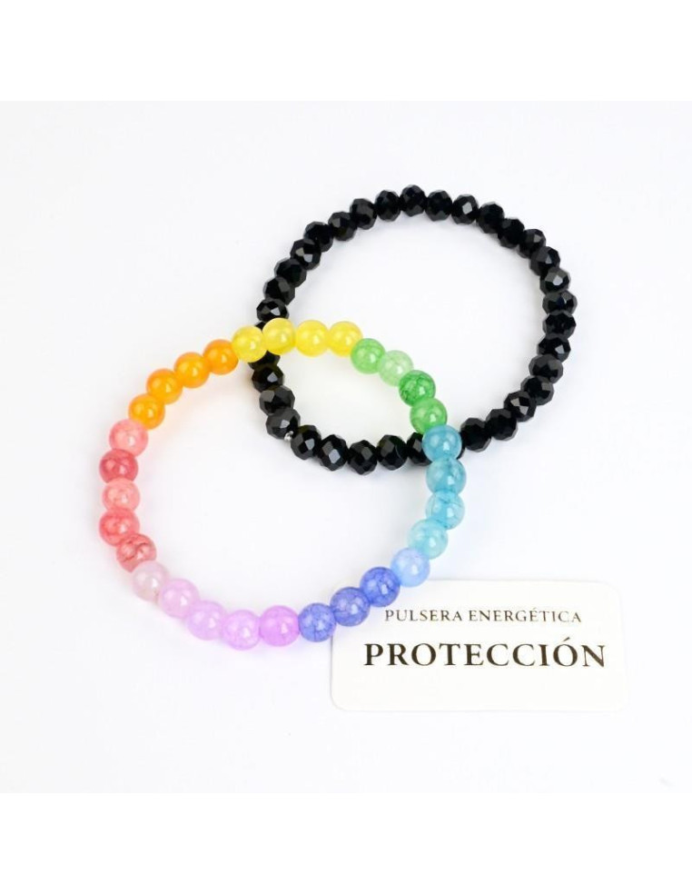 Set de dos pulseras elásticas de rocas de cristal y bolitas de vidrio con los colores Chakras.