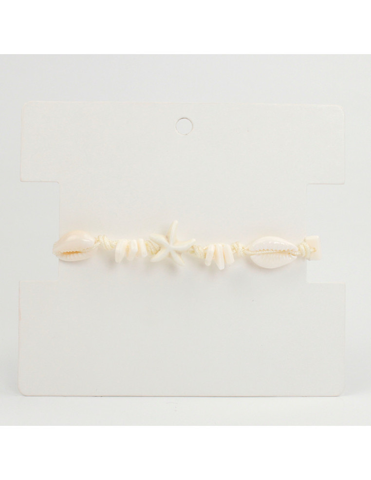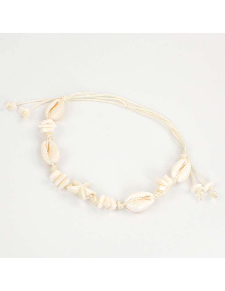 Pulsera de hilo enhebrada con buzios naturales, combinados con escallas de acrílico y dije pasante de piedra reconstituida con forma de estrella.