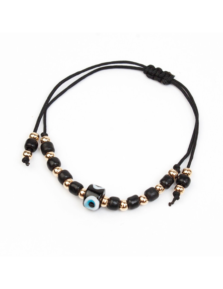 Pulsera de hilo con dije de vidrio, mostacillas, pasantes de CCB y cierre con nudo macramé.