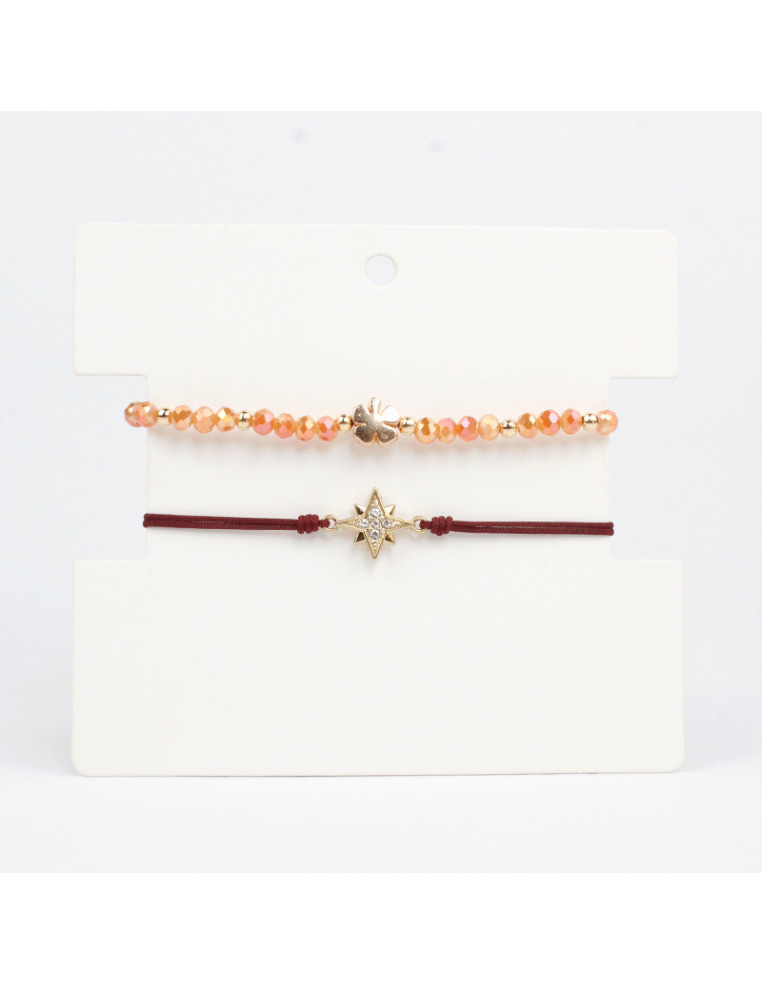 Set de dos pulseras, una elástica de rocas de cristal, pasantes de CCB y dije de fundición, otra de hilo con dije doble agarre y cierre con nudo macramé.