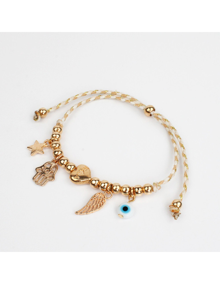 Pulsera de hilo con dijes de fundición y ojo de vidrio.