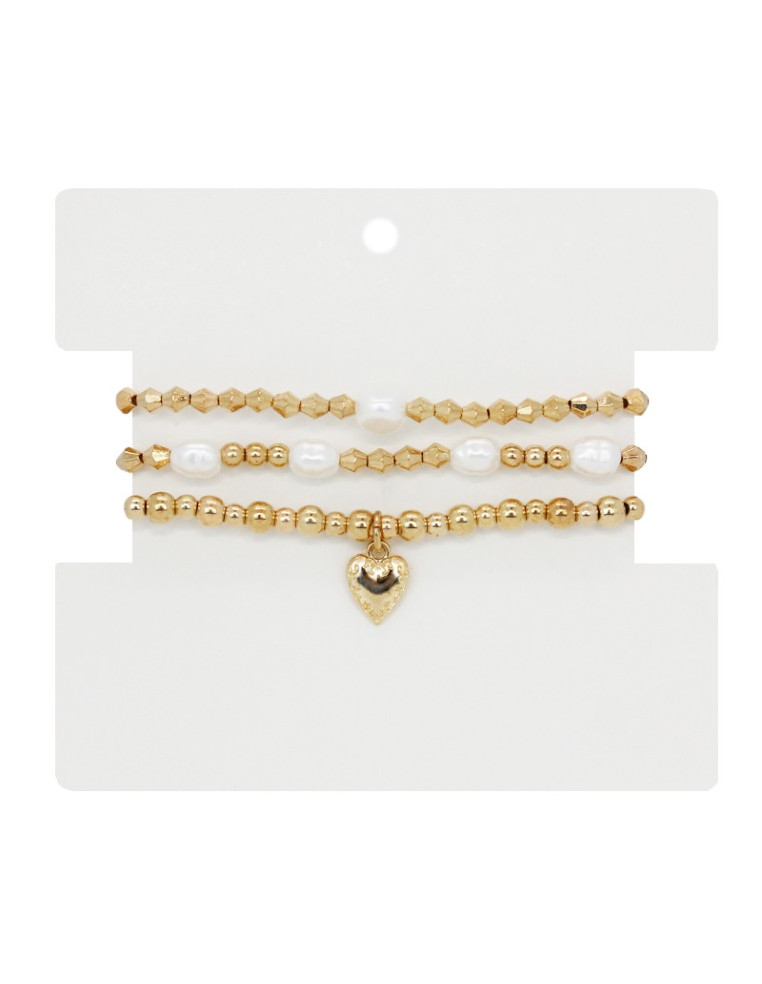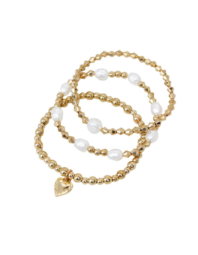 Set de tres pulseras elásticas con símil perlas de río y dijes exclusivos dorados.