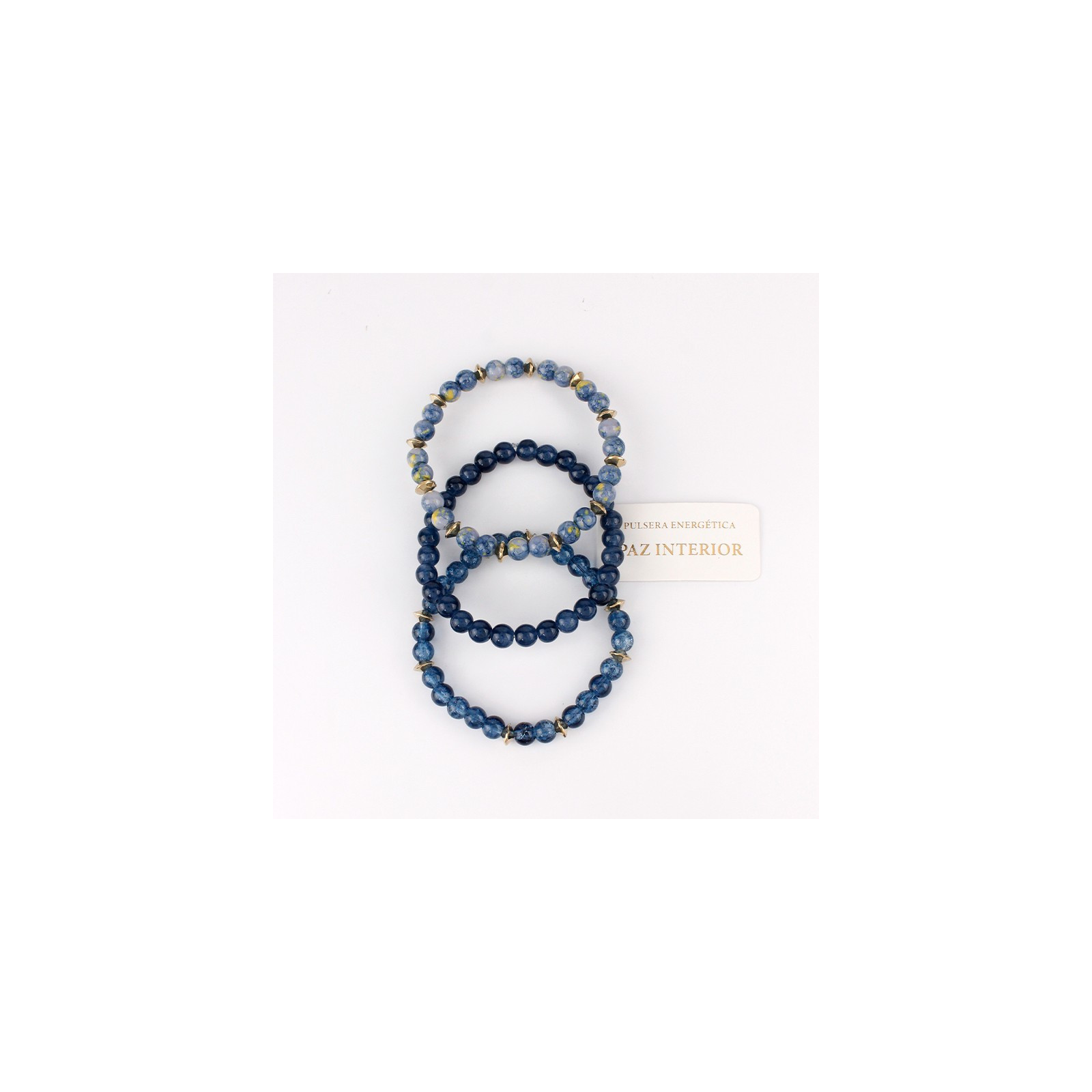 Set de tres pulseras elásticas de bolitas de vidrio energéticas.