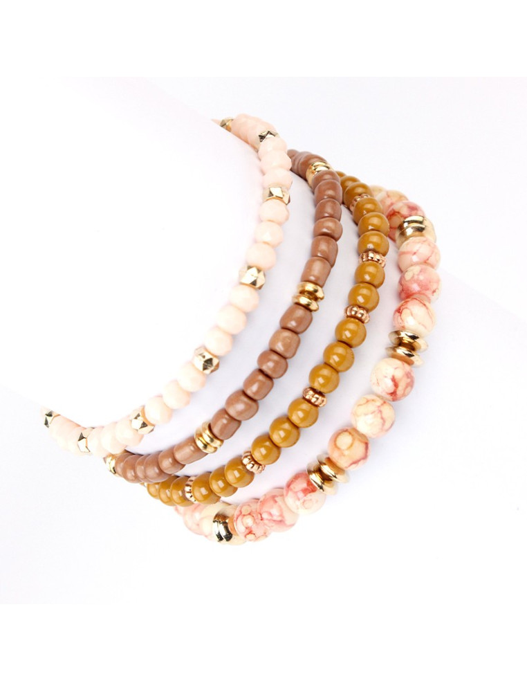 Set de cuatro pulseras elásticas de distintos tipos de piezas exclusivas como, bolita de vidrio marmolada, mostacillas esmerilada y roca de cristal.
