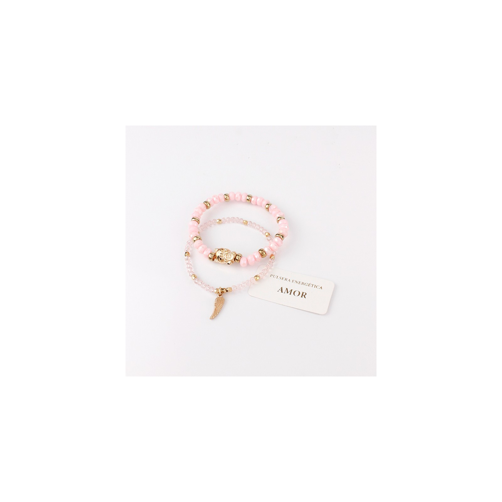 Set de dos pulseras elásticas, elaborada en piezas símil roca de cristal de mayor tamaño, piezas pasantes doradas con dije exclusivo y rocas de cristal de menor tamaño con piezas pasantes doradas.
