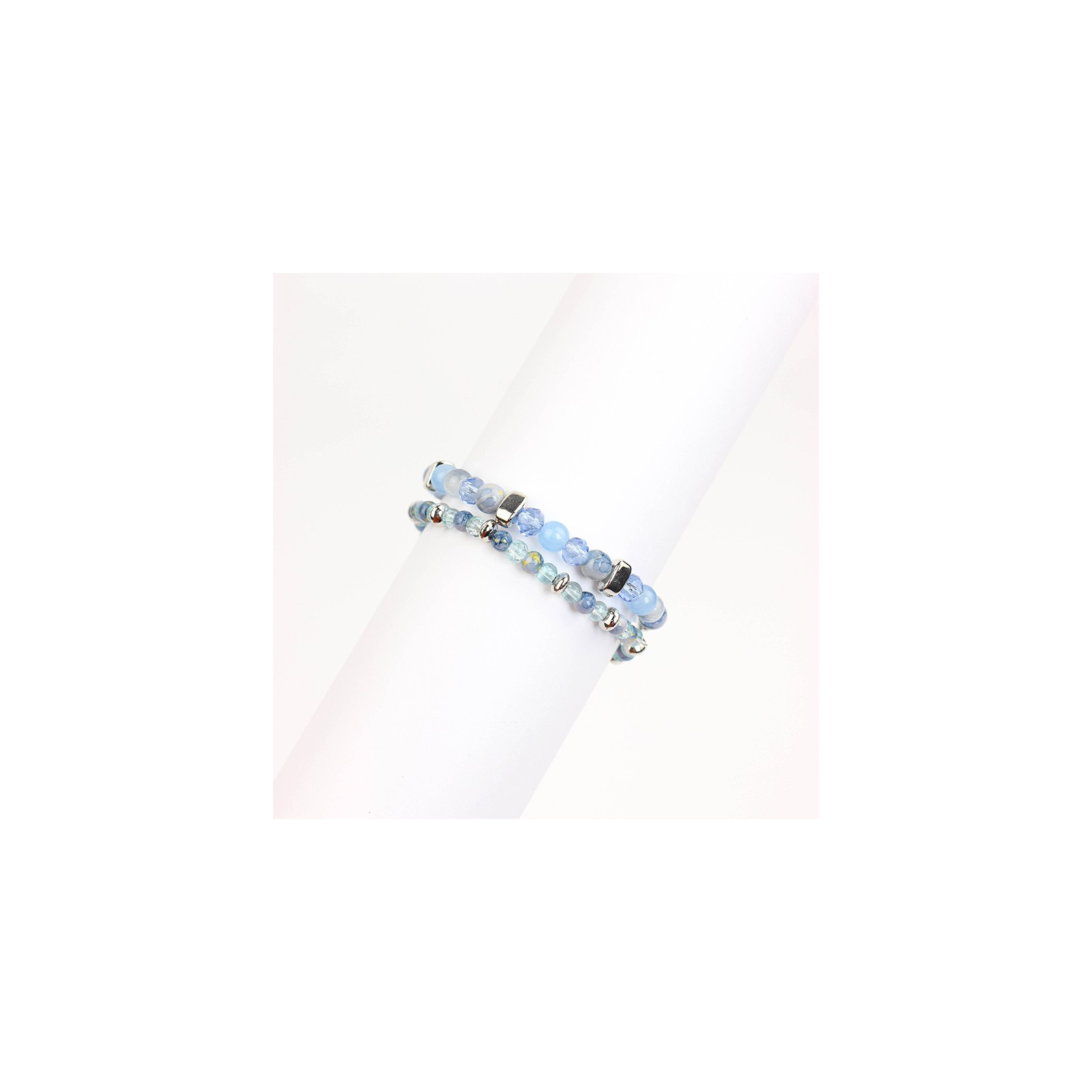 Set de dos pulseras elásticas elaboradas con bolitas de vidrio diferenciadas, combinadas con roca de cristal y piezas pasantes de CCB.