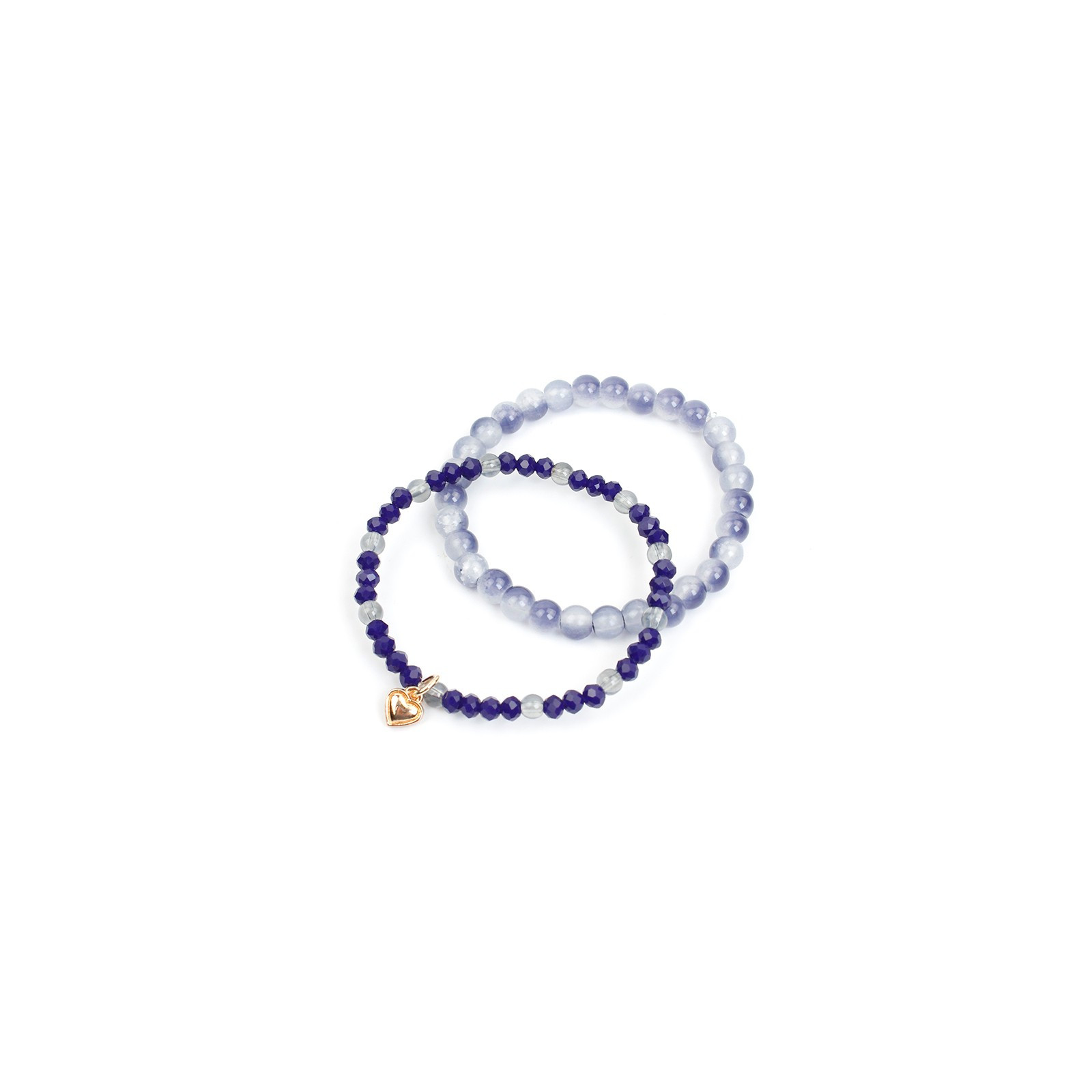 Set de dos pulseras elásticas, elaboradas en bolitas de vidrio exclusivas, combinadas con rocas de cristal y dije exclusivo con forma de corazón.