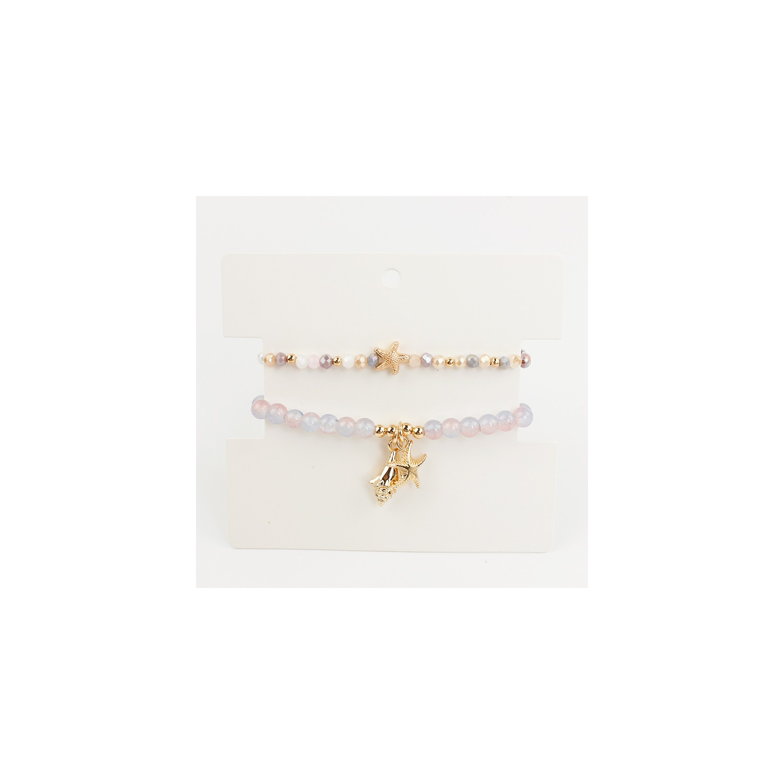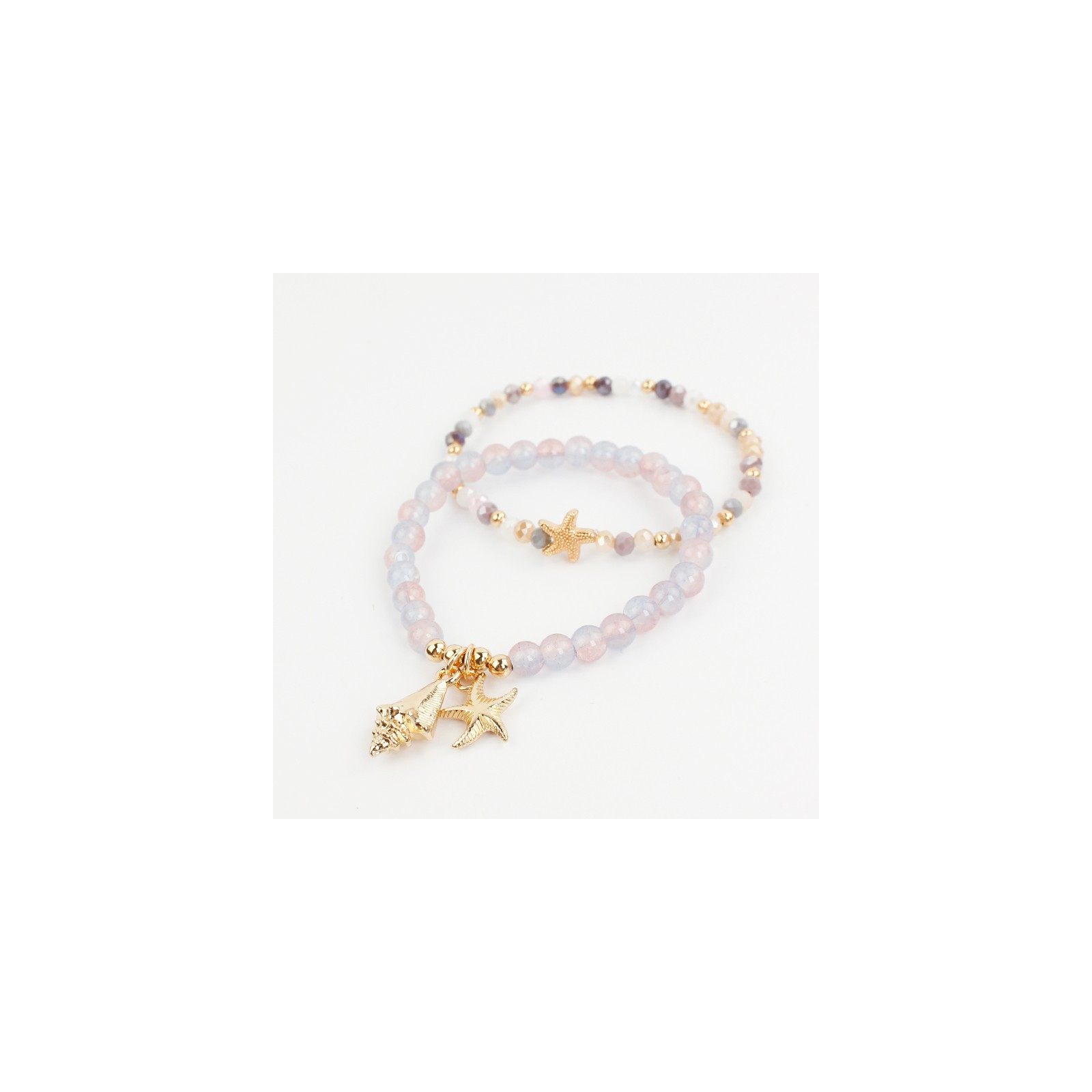 Set de dos pulseras elásticas, una de bolitas de vidrio estalladas, otra de rocas de cristal, ambas con dijes exclusivos de fundición marinos.