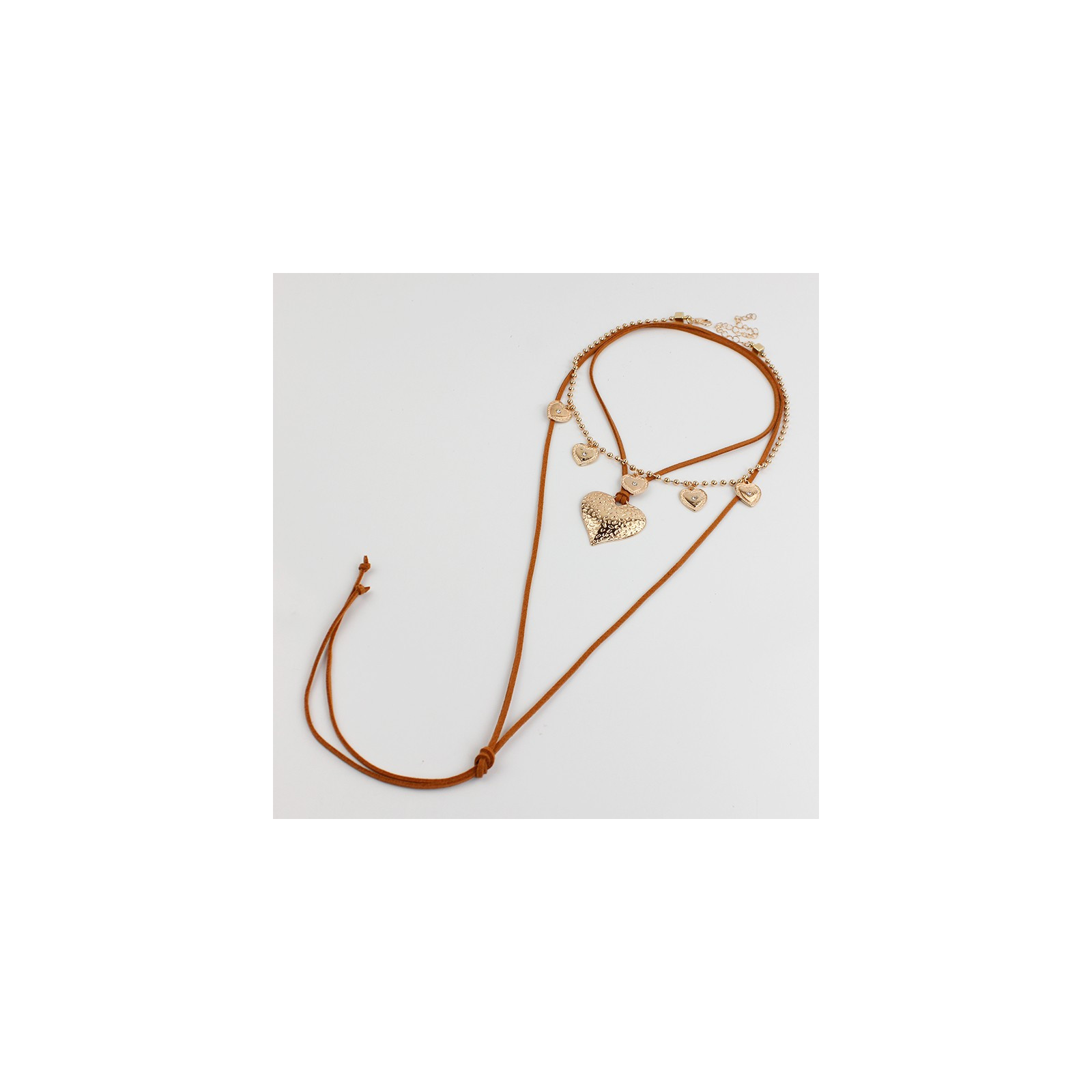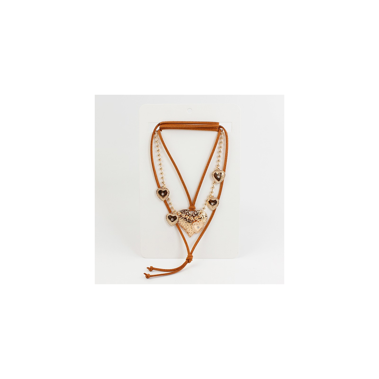 Set de dos collares, uno de cadena diferenciada con dijes exclusivos de strass con forma de corazón, otro de múltiples vueltas de gamuza con dije de fundición con forma de corazón.
