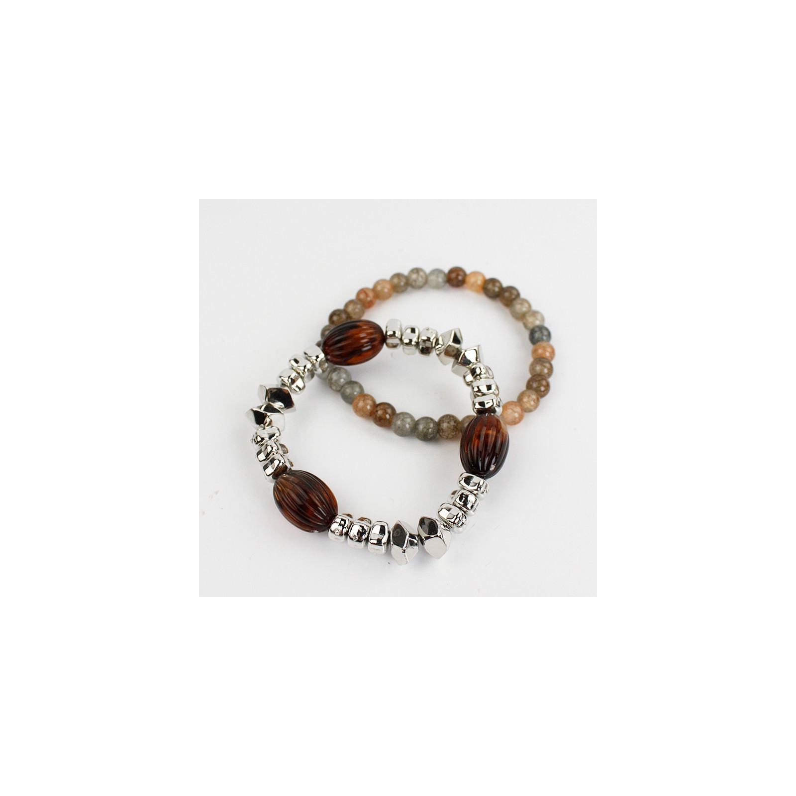 Set de dos pulseras elásticas, una de piezas de acrílico exclusivas combinadas con pasantes orgánicos de CCB, otra de bolitas de vidrio diferenciadas.