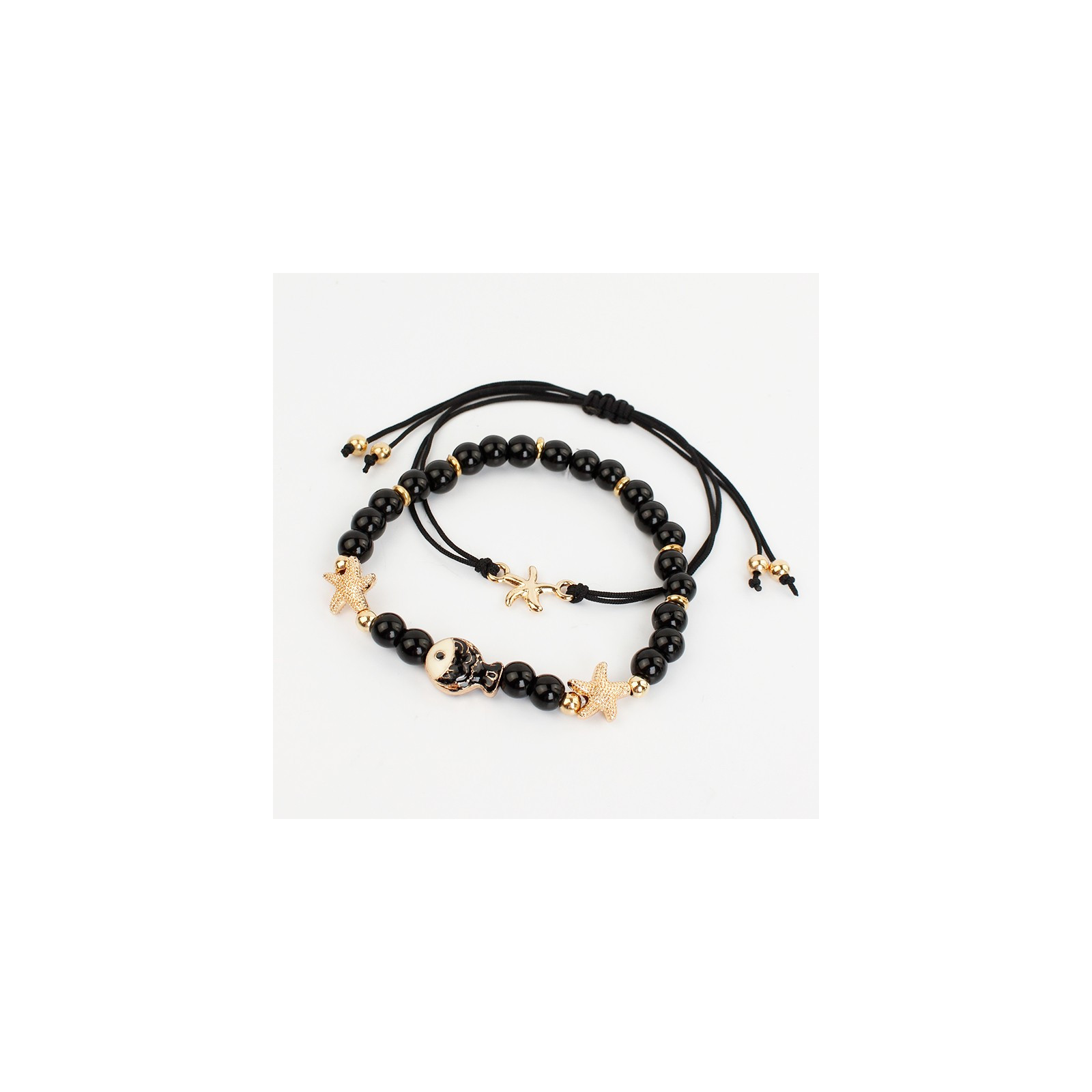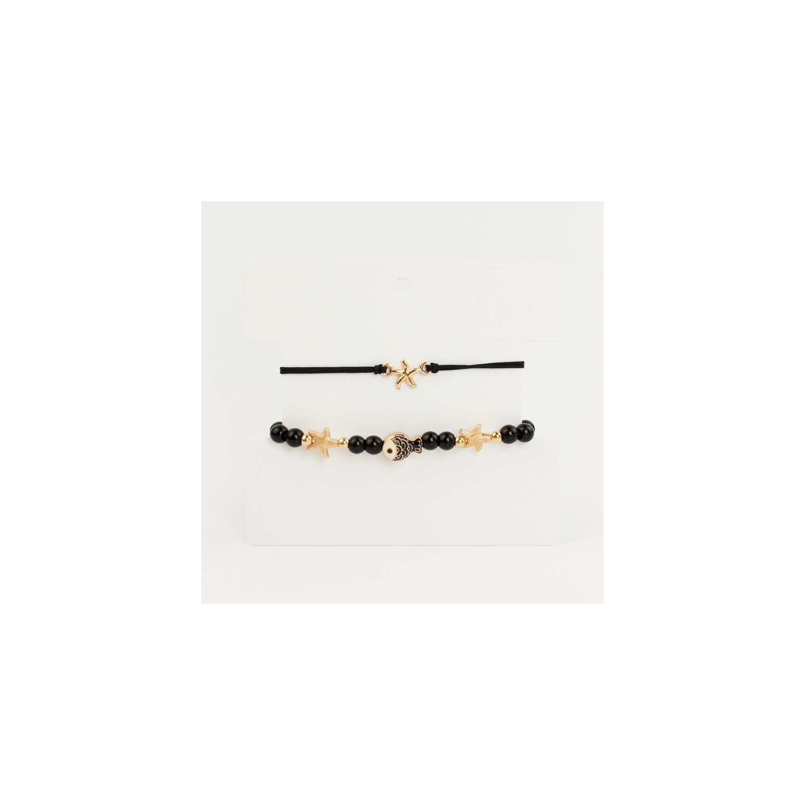 Set de dos pulseras, una elástica de bolitas de vidrio diferenciadas, combinadas con dijes pasantes de fundición con forma de estrella de mar y dije pintado a mano con forma de pez, acompañada de pulsera de hilo, con dije doble agarre con forma de sol y cierre con nudo macramé.