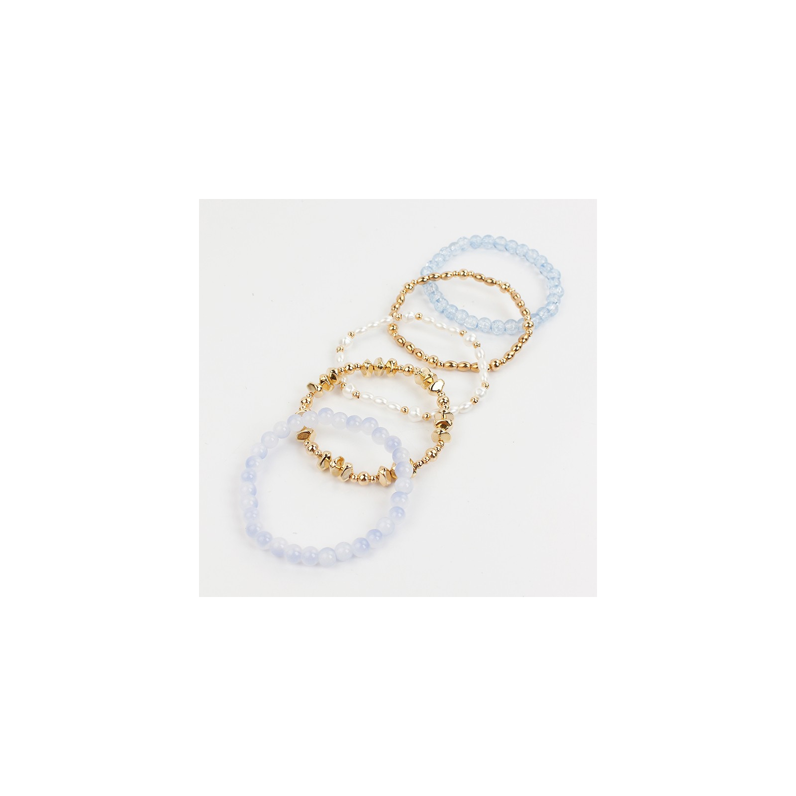 Set de cinco pulseras elásticas de bolitas de vidrio diferenciadas, combinadas con pulseras de perlas, y piezas orgánicas de CCB dorado.