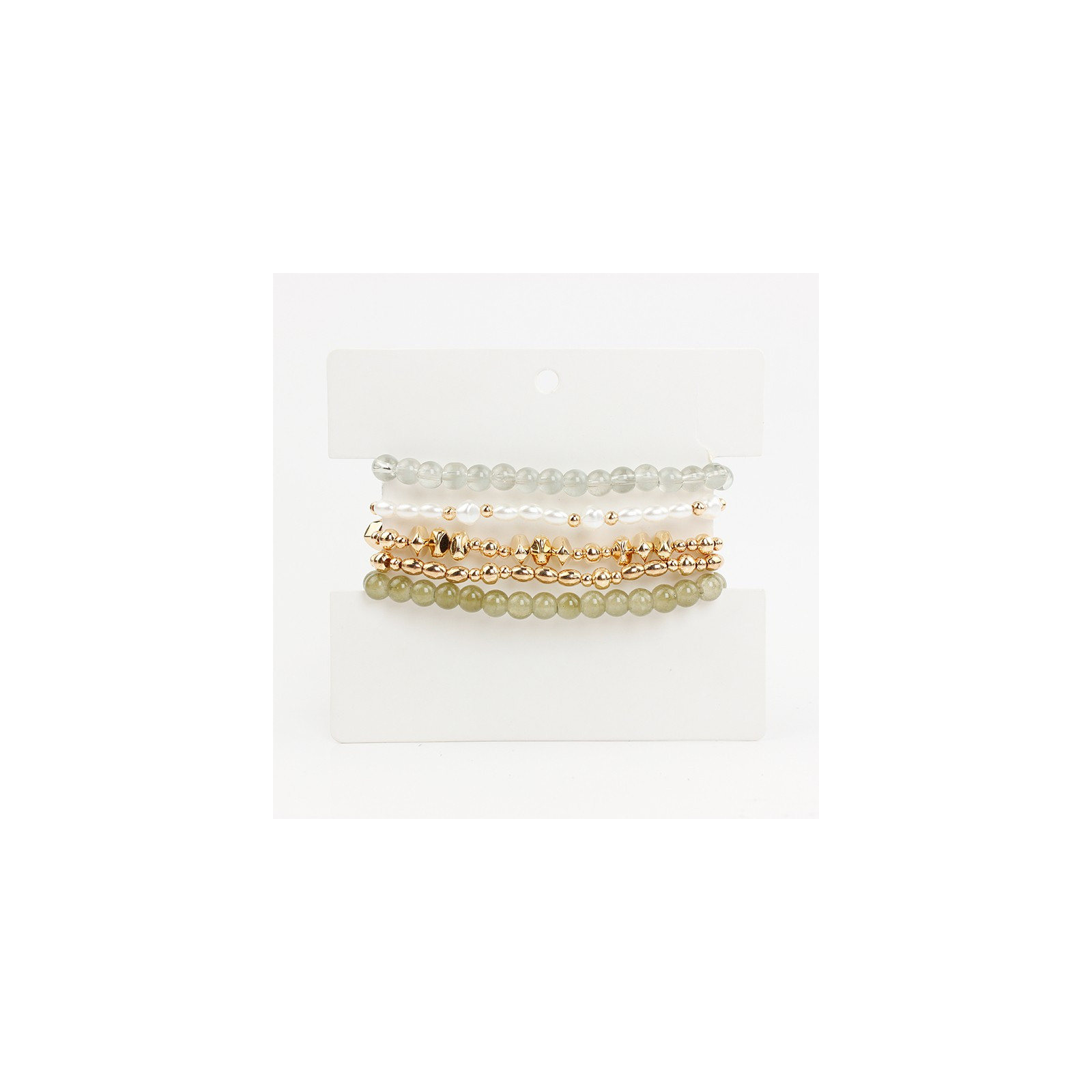 Set de cinco pulseras elásticas de bolitas de vidrio diferenciadas, combinadas con pulseras de perlas, y piezas orgánicas de CCB dorado.