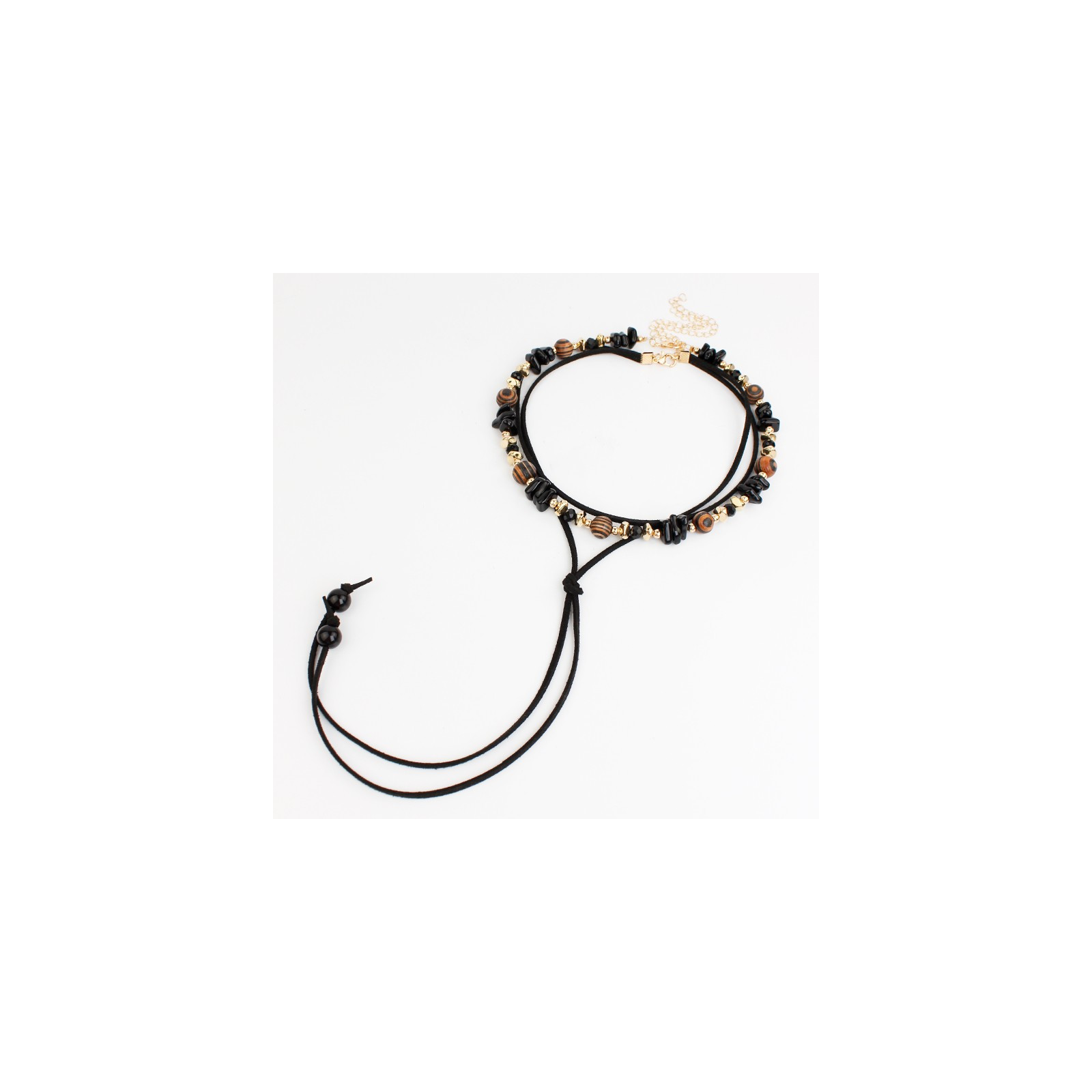 Set de dos collares, uno flexible de lenga enhebrada con escallas de acrílico, piezas de madera diferenciadas, pasantes de CCB y roca de cristal.