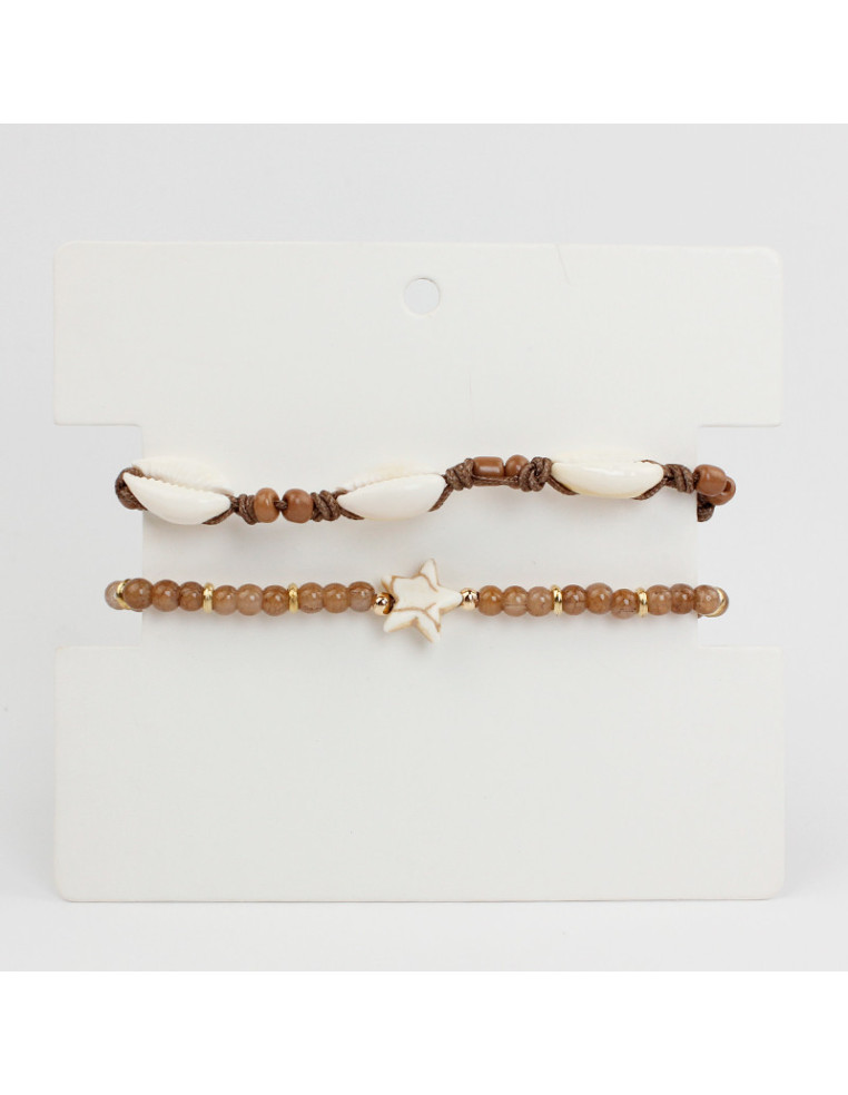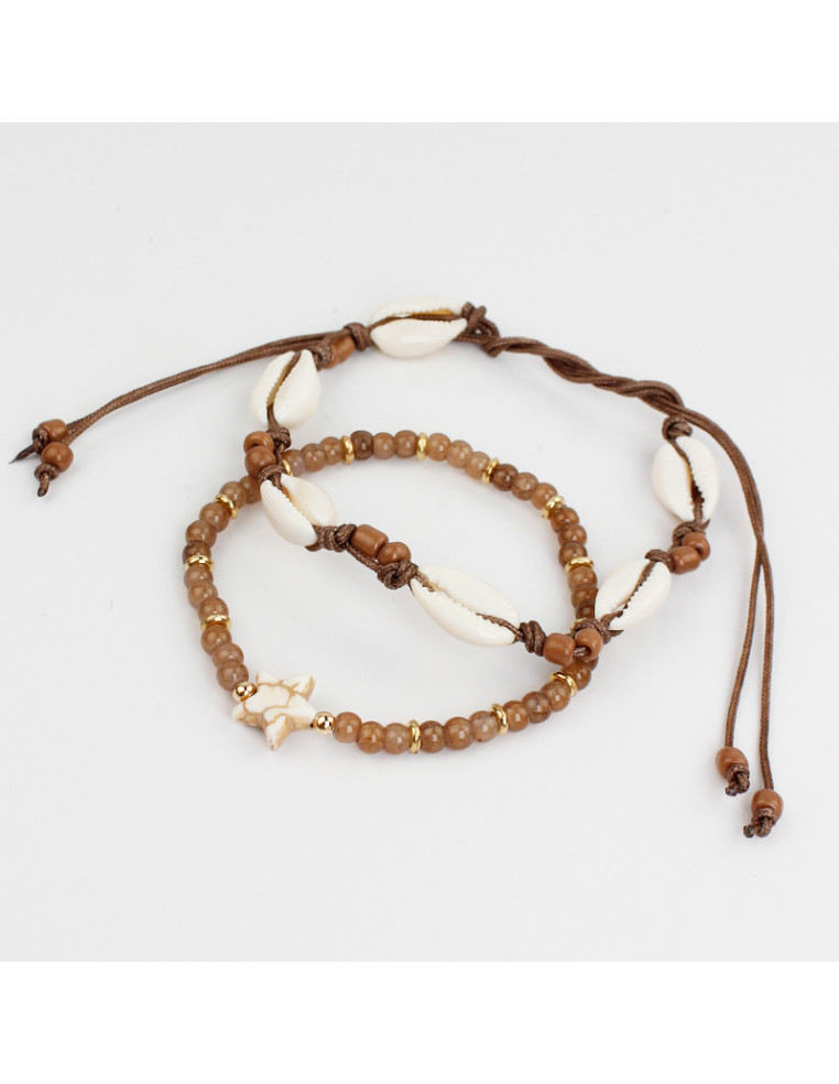 Set de dos pulseras, una elástica de bolitas de vidrio diferenciadas, combinadas con separadores de CCb y otra de hilo enhebradas con buxios natuales y mostacillas.