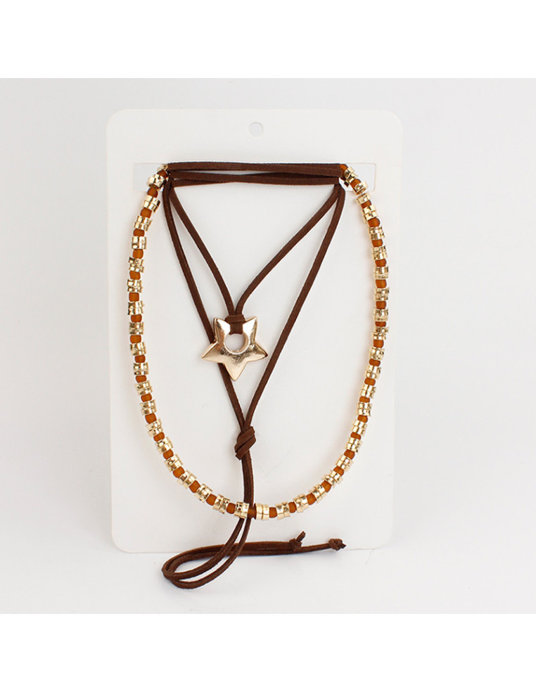 Set de dos collares, uno flexible de lenga enhebrada con mostacillas y piezas separadores de CCB, otro de gamuza de múltiples vueltas con dije exclusivo de fundición.